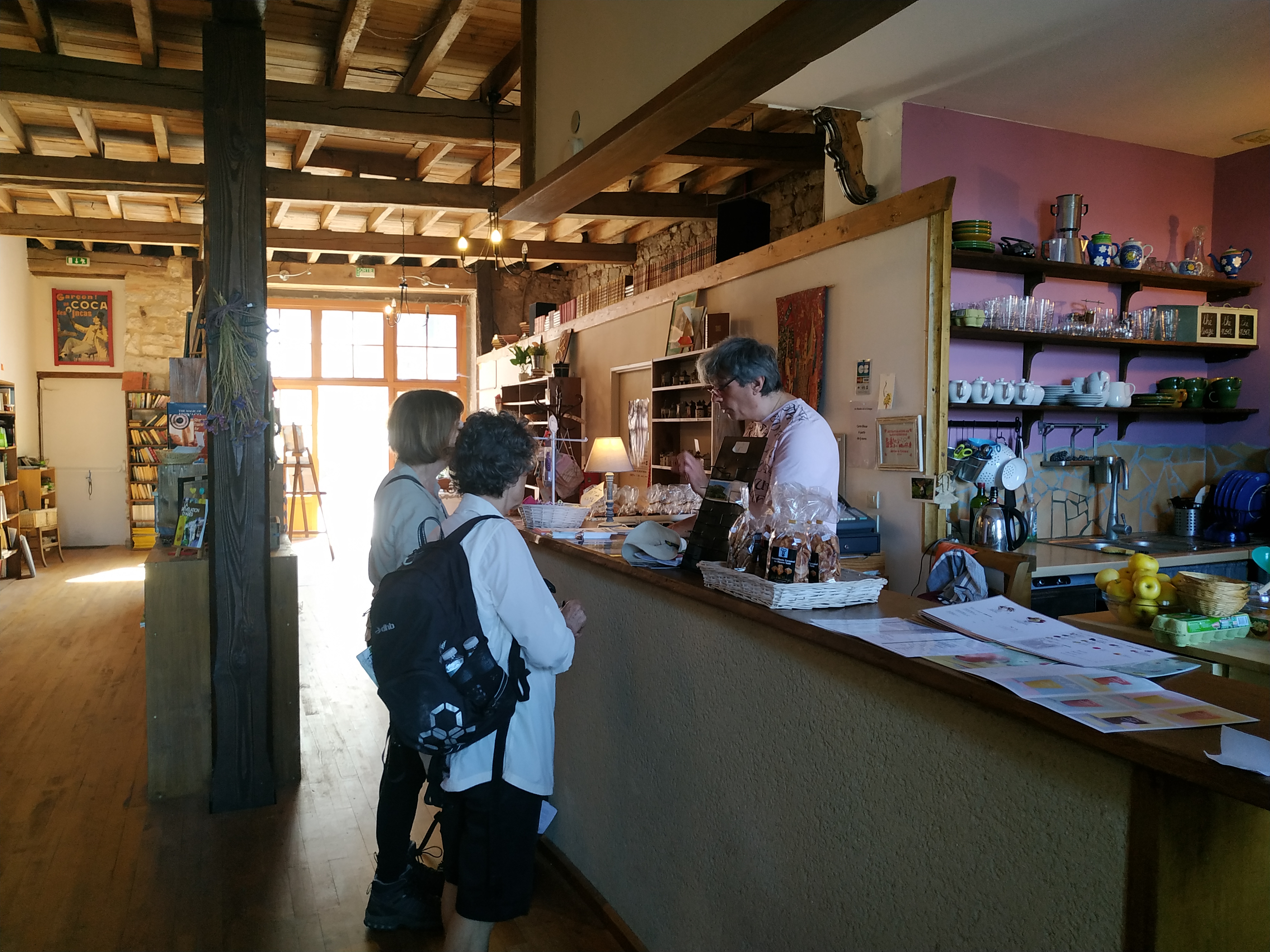 Bel endroit avec un propriétaire sympathique. Jolie boutique de cadeaux tranquille vendant des produits artisanaux et des livres. Il dispose d'un joli café servant des salades simples et authentiques, des sandwichs, des smoothies et un bon verre de vin, préparés à partir d'ingrédients locaux. A un point de vue incroyable sur une immense vallée paisible. Bon endroit pour déjeuner et prendre un café dans un magnifique village médiéval français.
