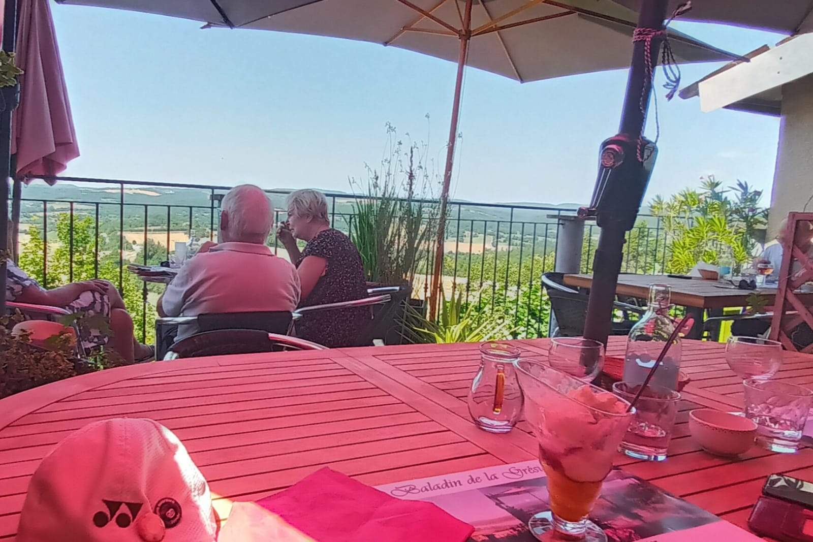 Lorsque le monde m'insupporte avec ses talibaneries,ses covideries,ses sanitaireries,je me refugie sur la terrasse du Baladin de la Gresigne pour déguster une copieuse salade généreusement préparée par le propriétaire aimable,aux petits soins pour ses visiteurs.Aujourdhui,il est accompagné par une Princesse veillant sur les ouailles du Baladin.Quel lieu enchanteur, quelle terrasse sublime, quel rêve d'un décor immuable.En entrant ici, bercé par une douce mélodie,on oublie l'enfer citadin,mortel face à l'éternité. Goudouli