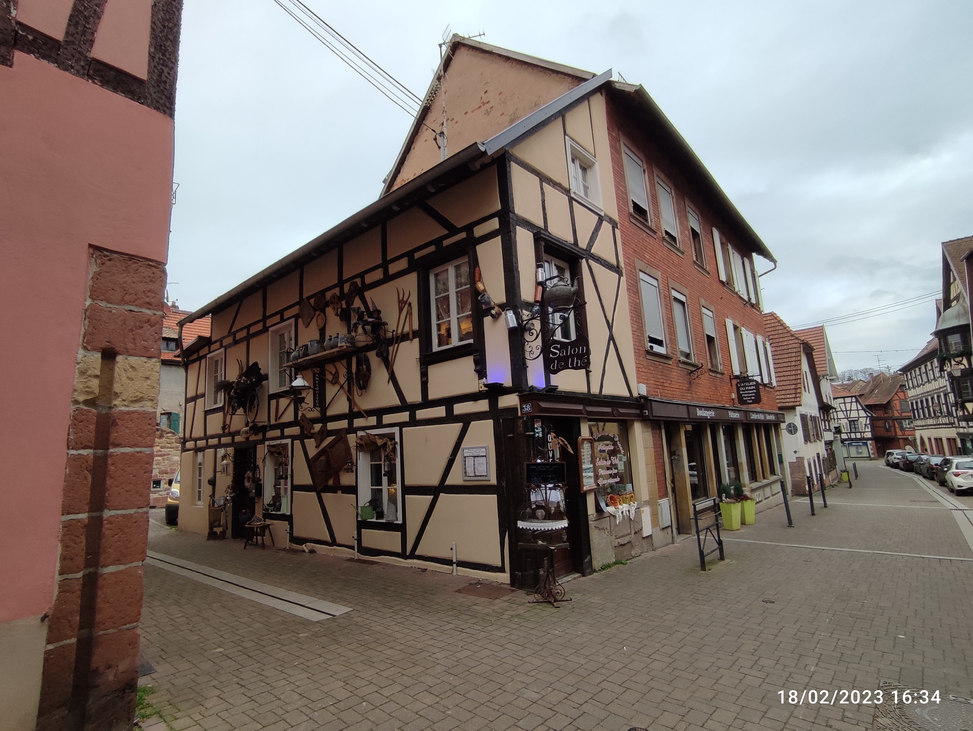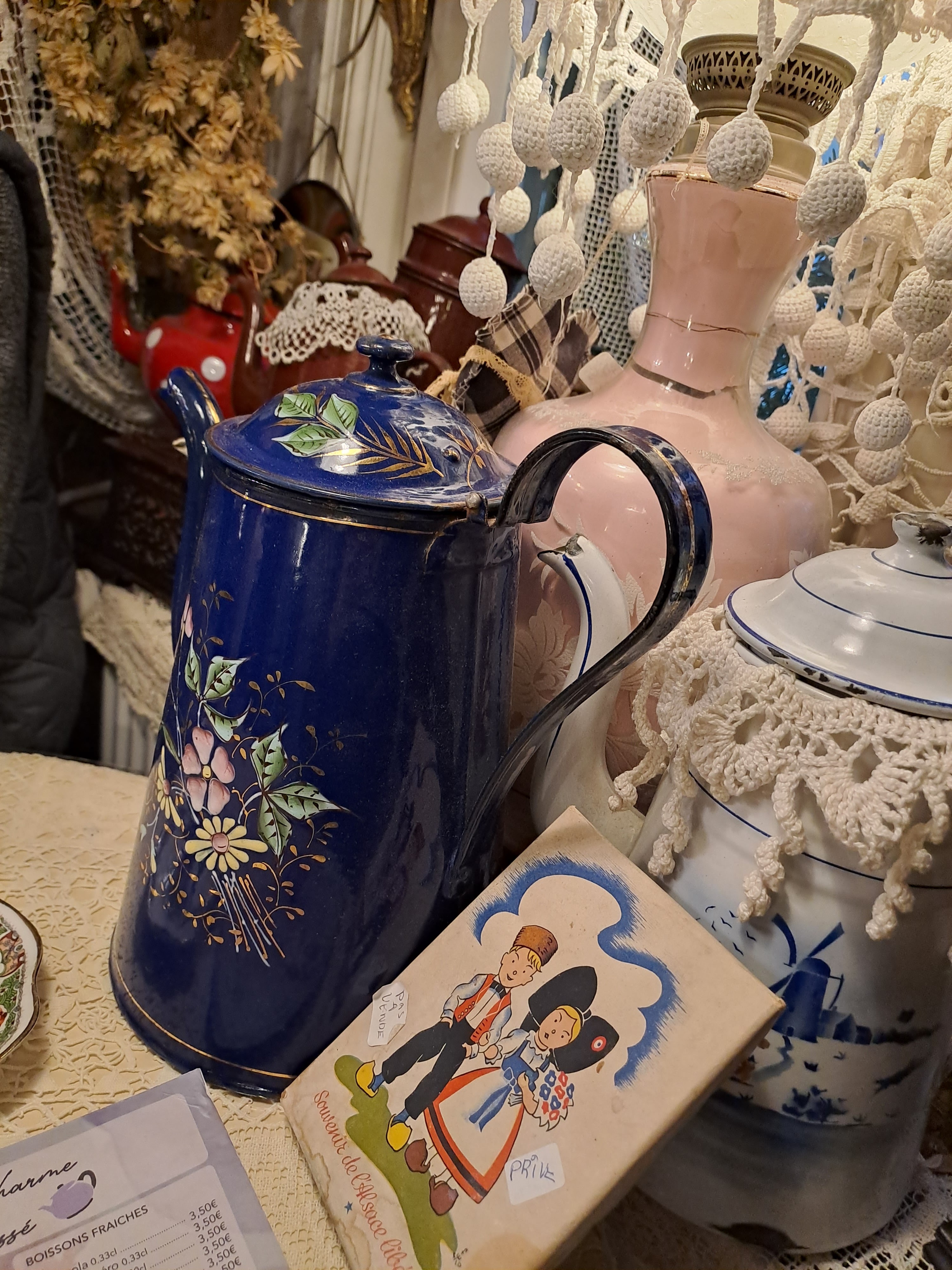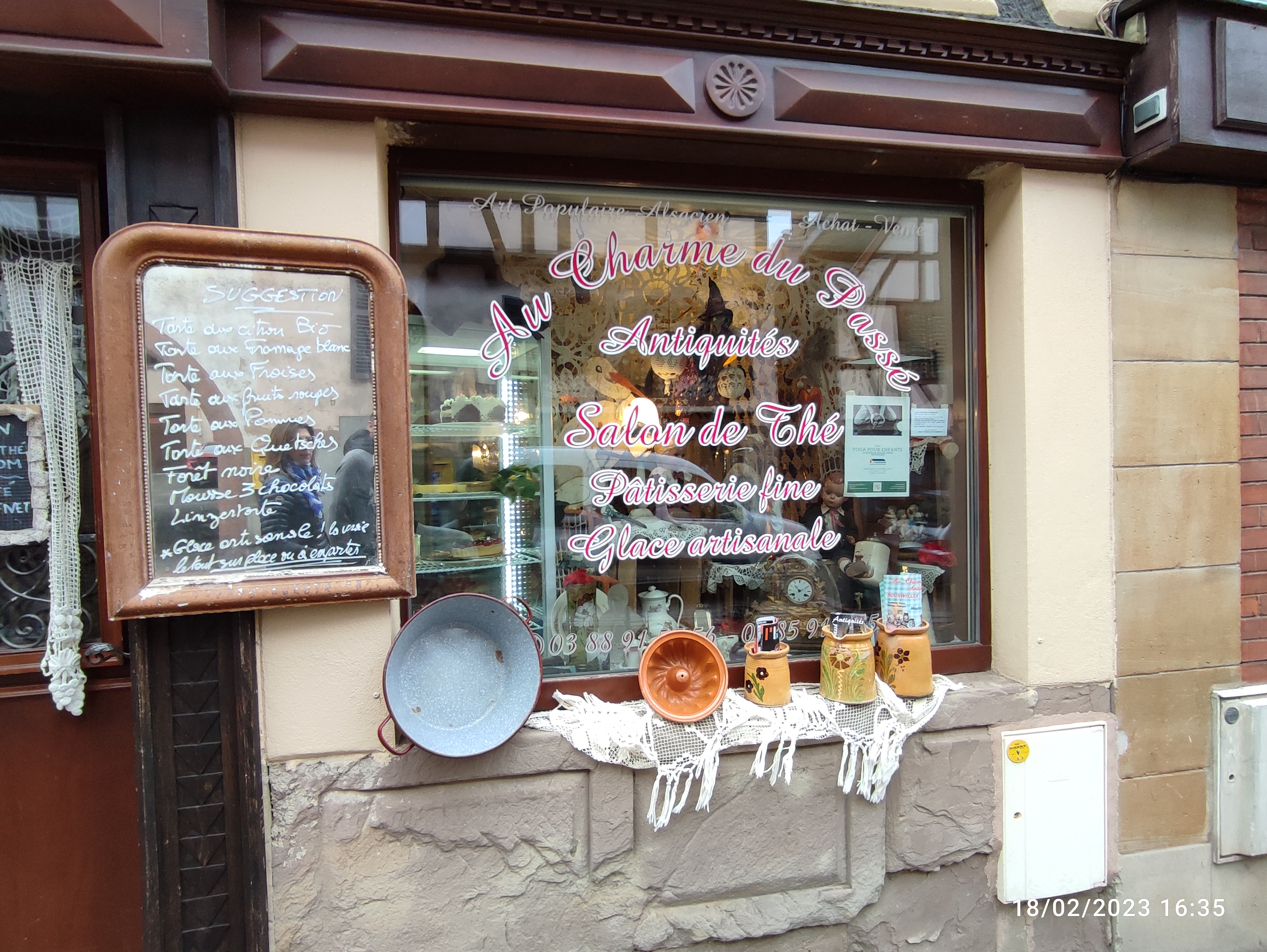 Attention inoubliable !!! nous avions remarqué précédemment un petit salon de thé à Bouxwiller qui nous avait charmés car l'extérieur était charmant. nous y sommes entrés cette fois et avons entrepris un véritable voyage dans un monde enchanté. La salle est petite et partout, au plafond et aux murs des dentelles alsaciennes ont été suspendues. il faut vous dire que ce salon de thé est aussi un magasin d'antiquités. Partout des objets charmants, partout des lustres, des pots, des vases, des dentelles.... la patronne, aussi jolie et accueillante que son établissement, nous a charmés. Nous avons commandé une forêt noire et un une coupe a base de meringue de crème de marron et de chantilly. le temps que les douceurs arrivent j'ai gravi l'escalier, dont les contre marches sont garnies...de dentelles, pour visiter l'autre salle de restauration, pleine elle aussi de vaisselle et. bibelots a vendre et une petite pièce oui j'ai chiné une très jolie carafe en grès bleu des Vosges. Nous avons aussi acheté une charmante estampe représentant une maison à colombages. Puis, vint le moment de gouter à nos douceurs. La foret Noire s'est avérée aérienne à souhait et ma coupe aux marrons absolument magique. Des desserts maison merveilleux. nous sommes partis a regret en nous promettant de revenir tres vite.