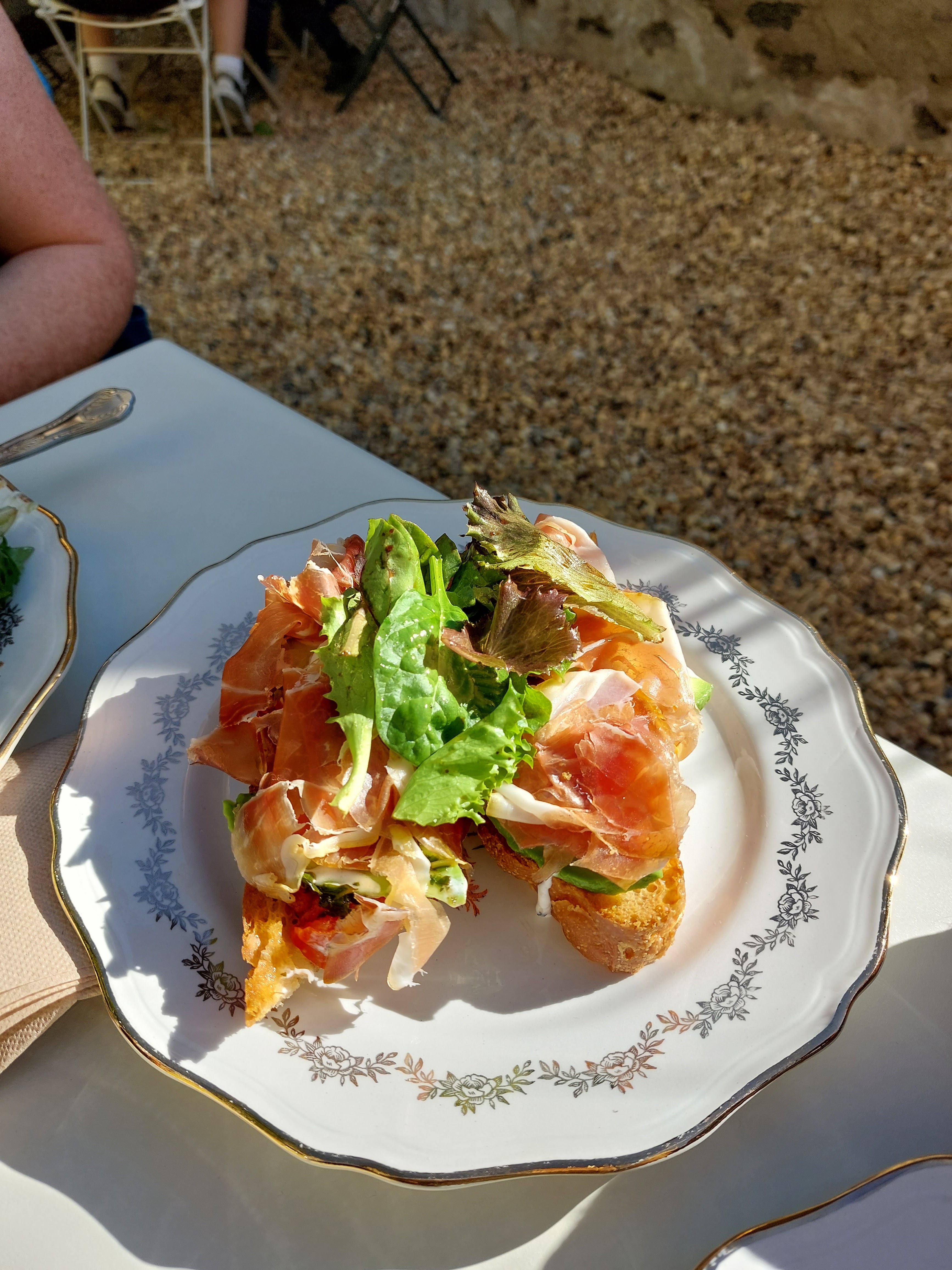 Déjeuner parfait et délicieux sur la terrasse au soleil avec la formule salé (focaccia serano burata) + sucré