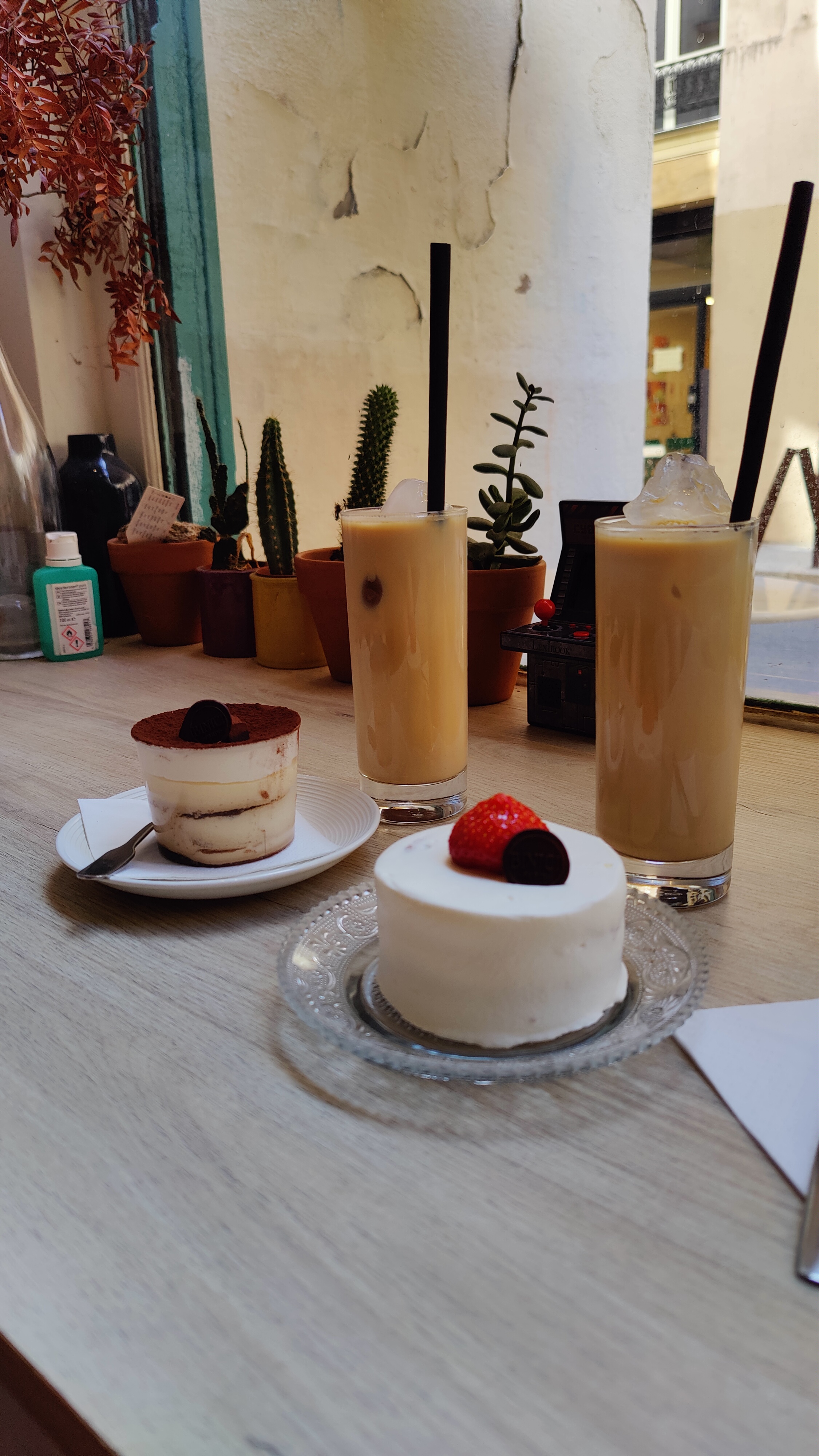 Lieu calme et tranquille pour aller prendre des dessert accompagné d'un café. Gâteau à la fraise et gâteau au taro avec un café allongé. Les prix sont corrects. Les petites plantes qui décorent la pièce sont tellement mignonnes et elles dégagent une odeur agréable. J'aime