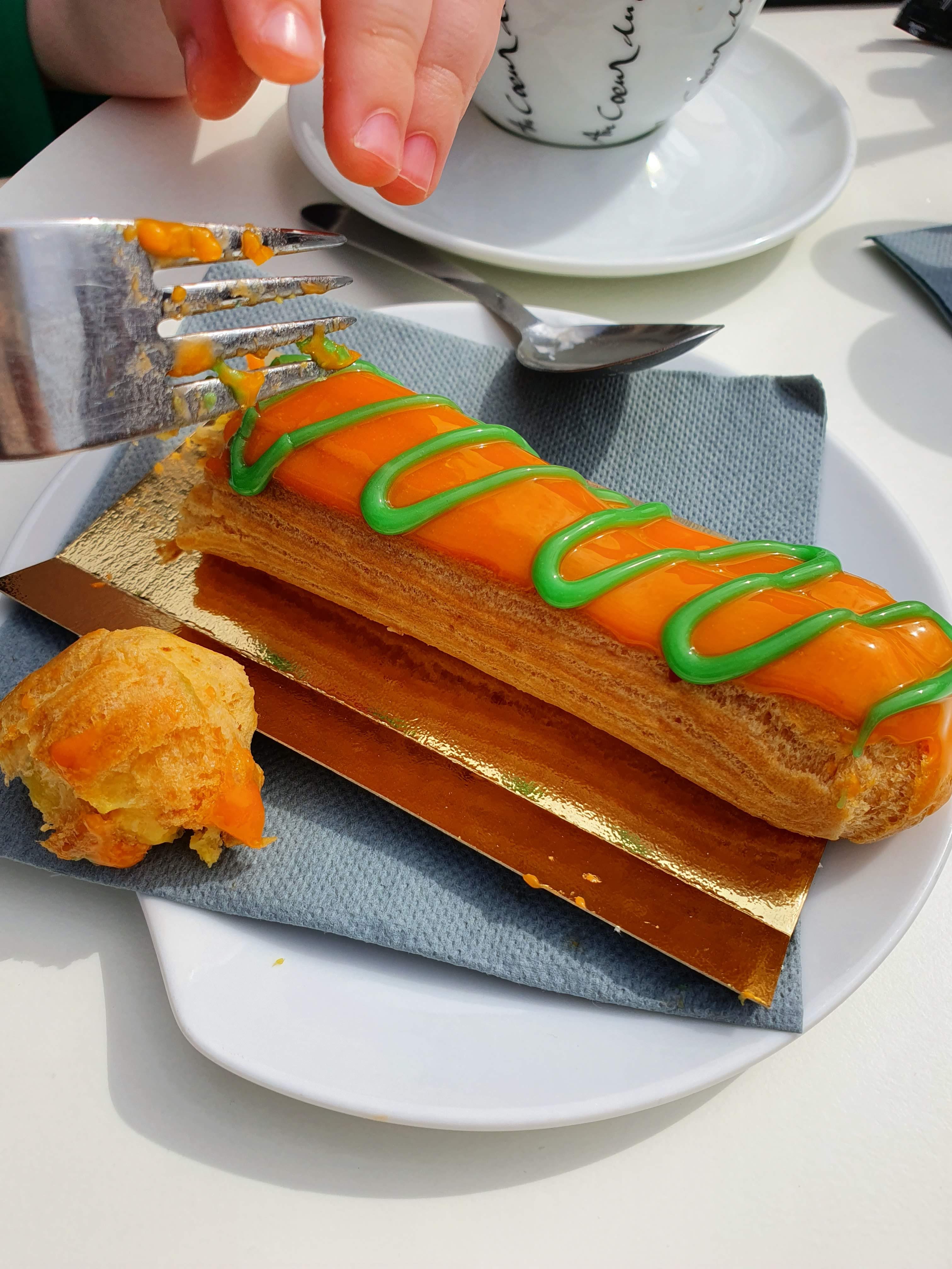 Éclair mangue.vanille noisettes caramélisées Une merveille. Pâte onctueuse. Appareil goûteux. Bravo. Thierry cheveau Le Pizzburg St Jean de monts