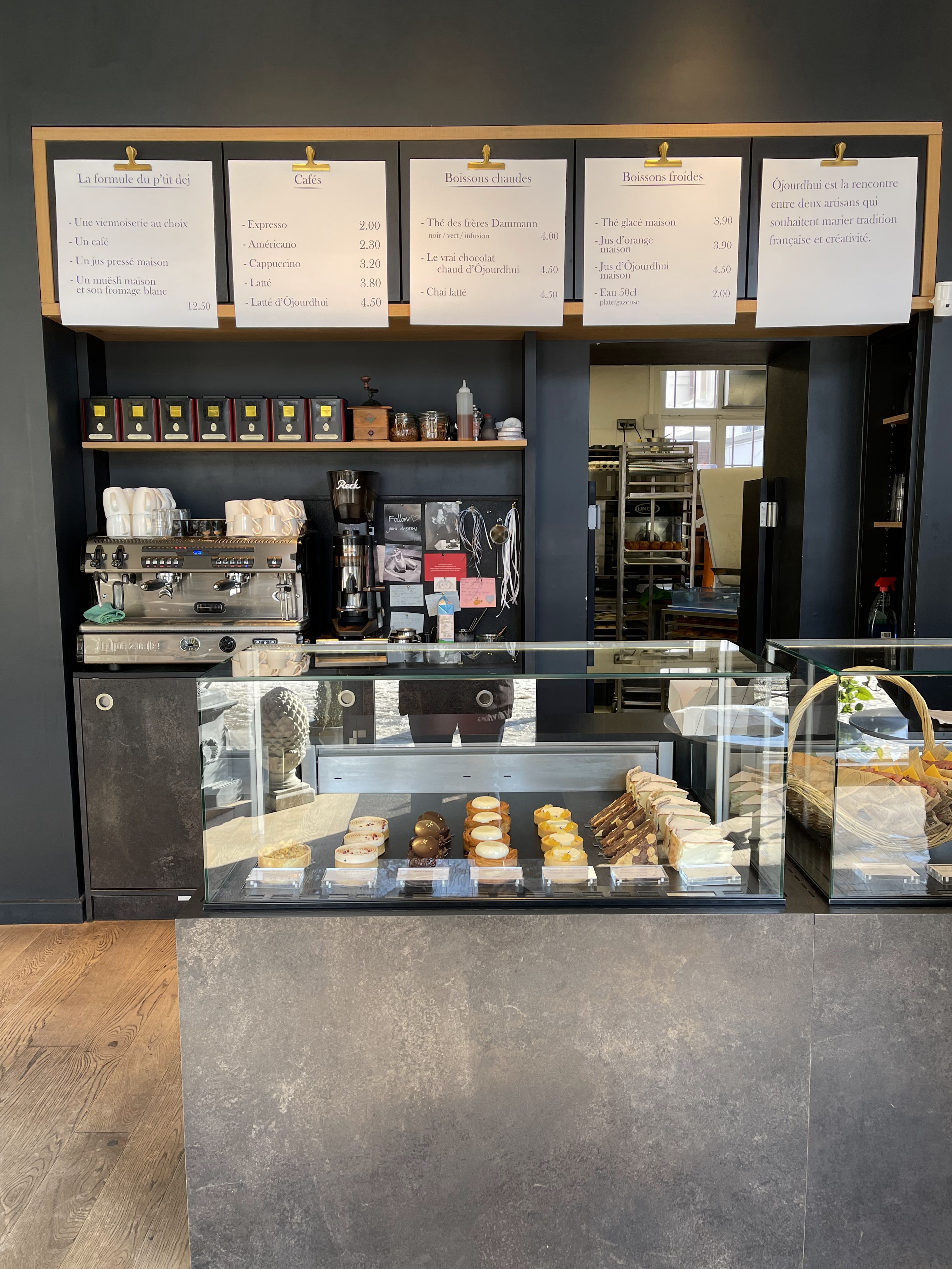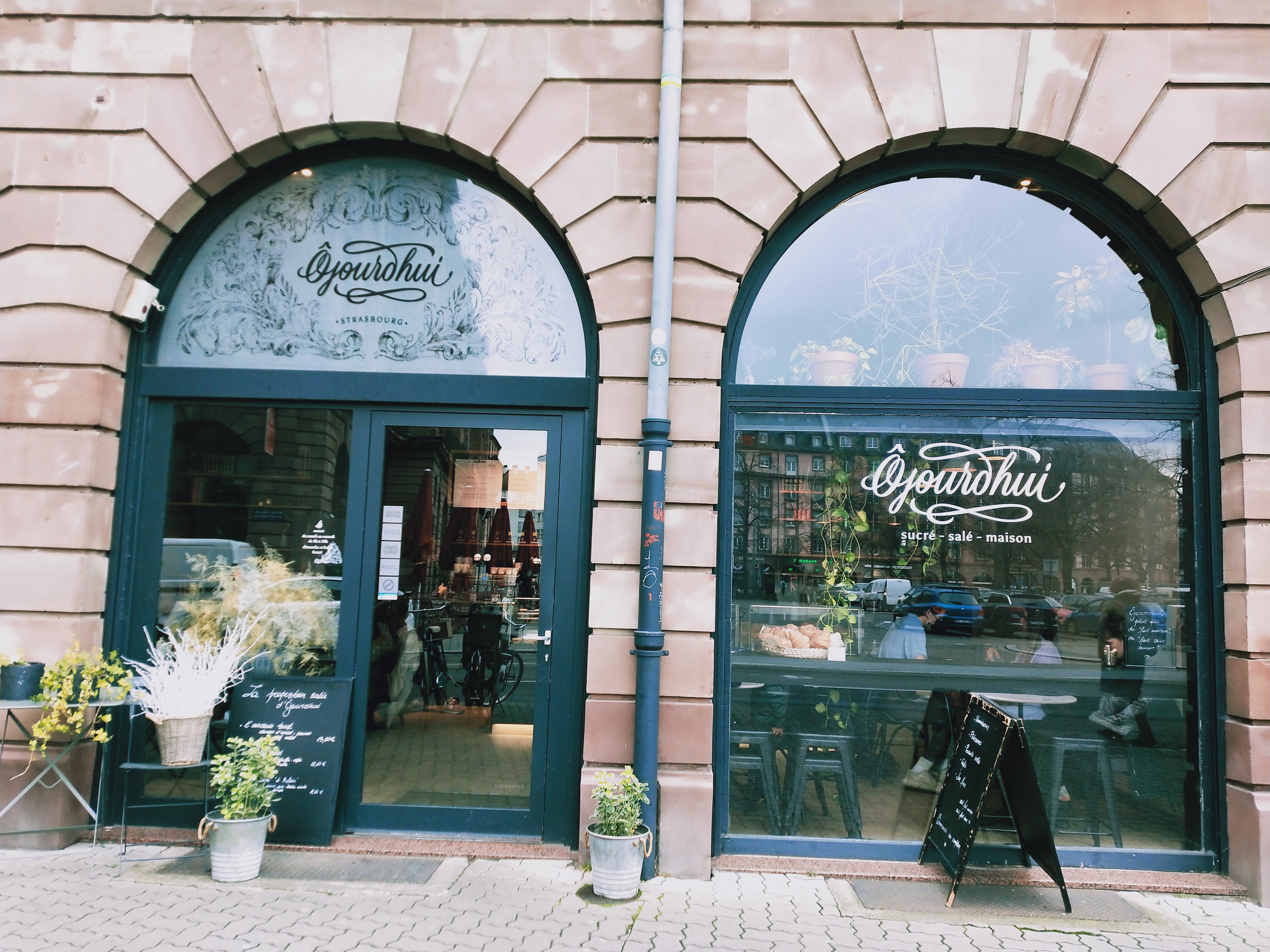 Chez Ôjourhui, l'ambiance y est feutrée et haut de gamme. On s'y sent super bien pour revivre le vrai goûts des viennoiseries/pâtisseries 100% maison face à des bâtiments Alsaciens au travers de gigantesque vitrines avec de la musique lounge en fond sonore. Un jus pressé de menthe/citron-verre/épinard et un chocolat chaud sont servis avec une tartelettes hypnotiques à la framboise et un pain au chocolat praliné qui nous permet de prendre un élan pour attaquer la semaine ou pour faire tomber la pression de cette dernière.