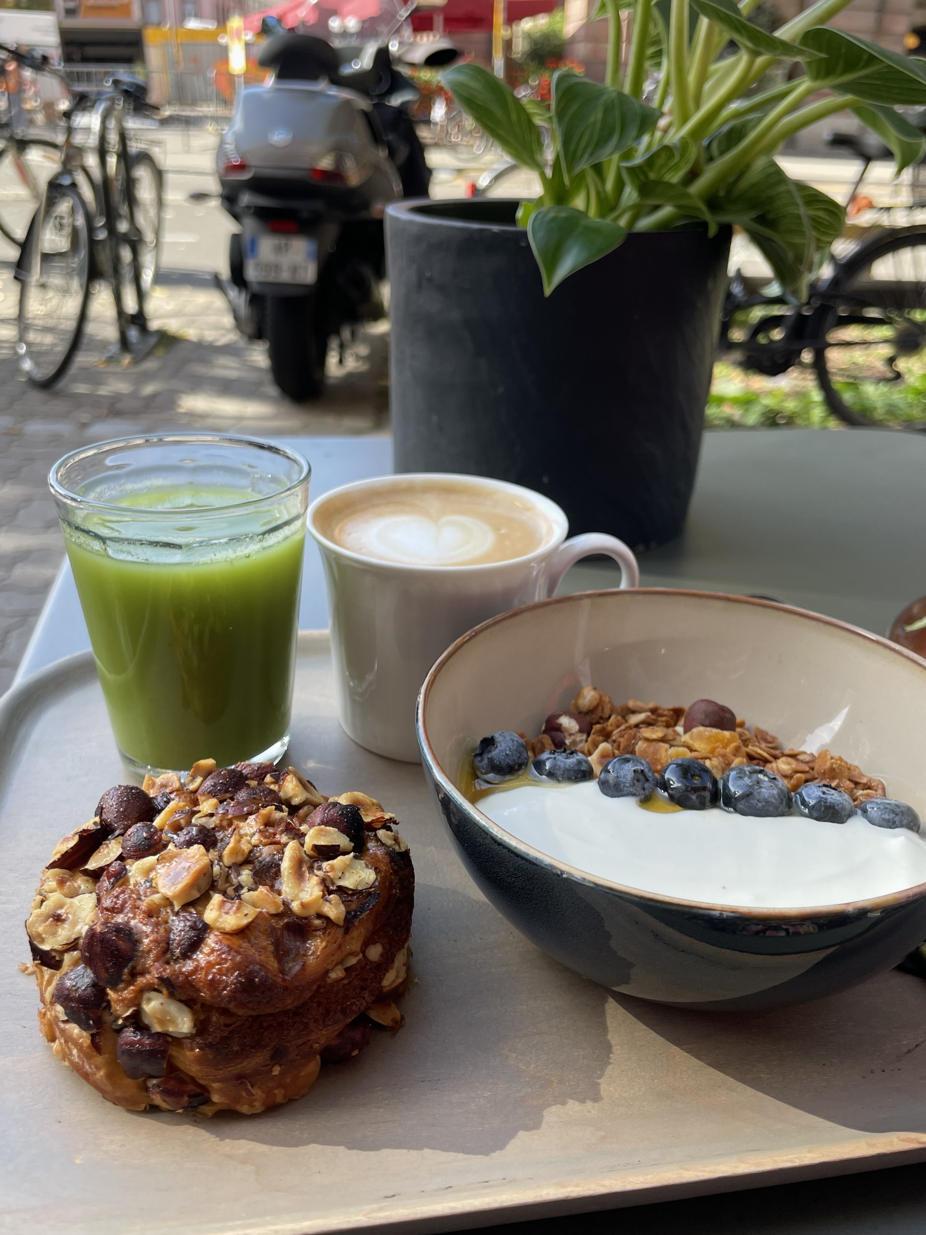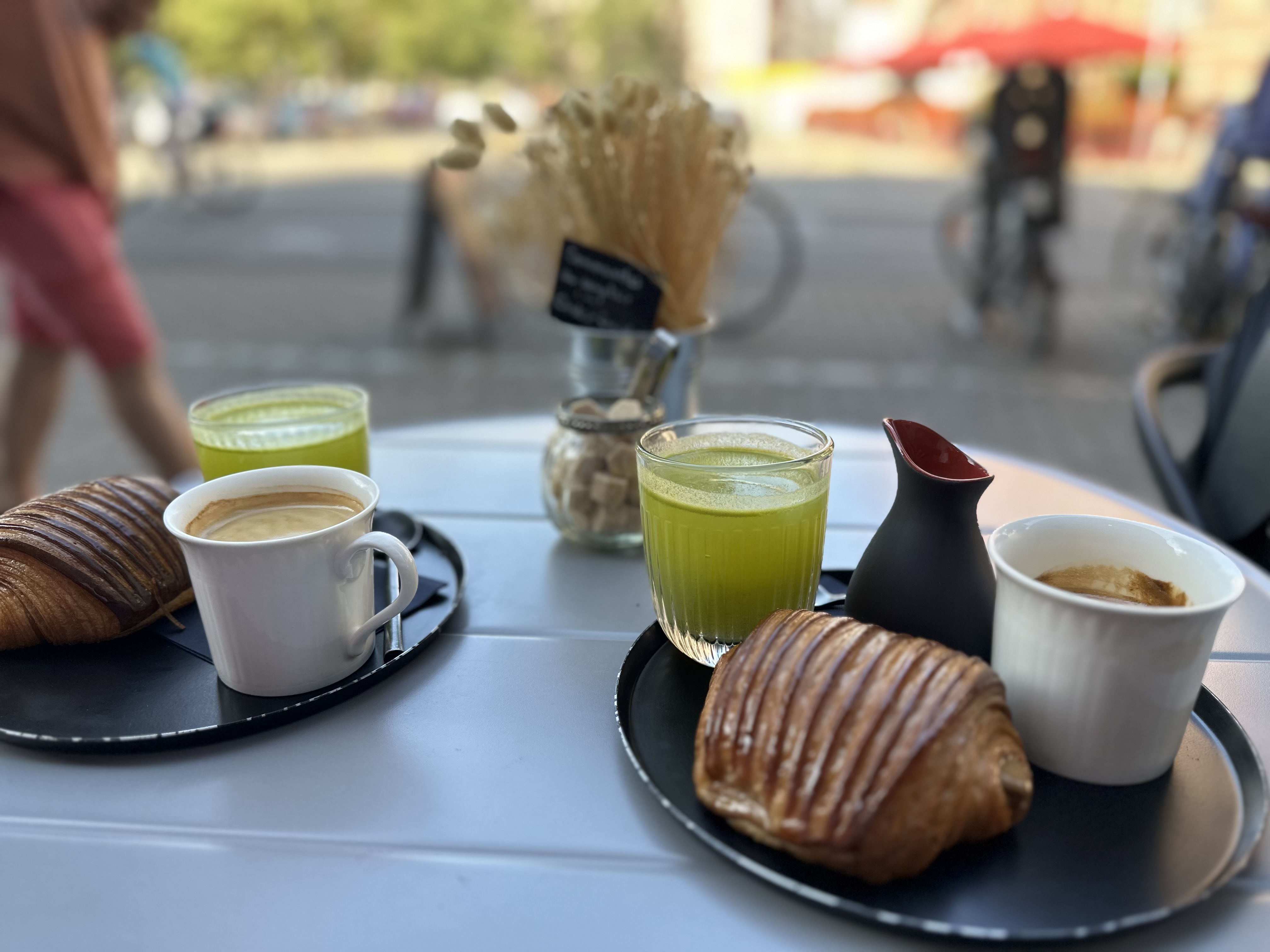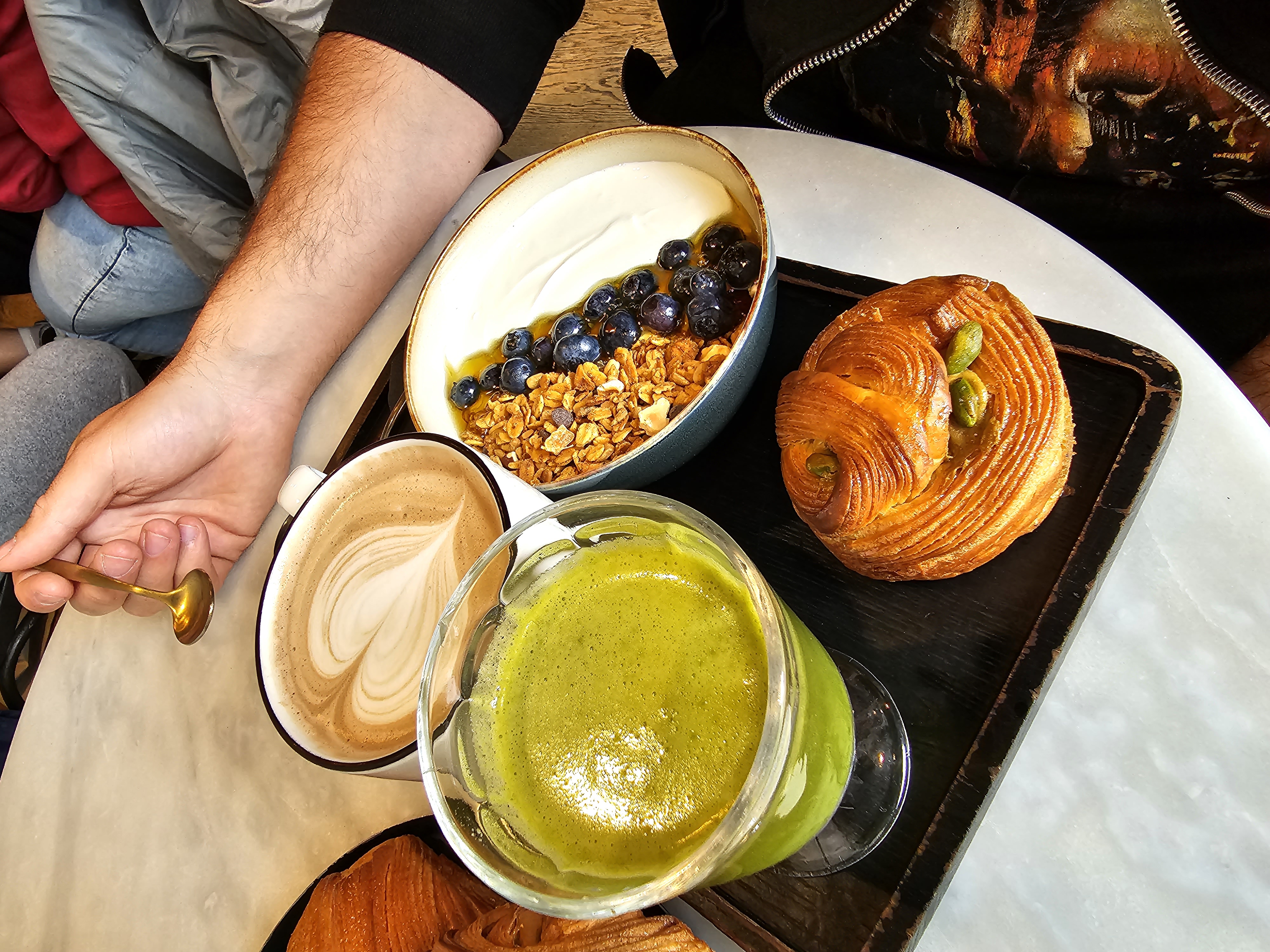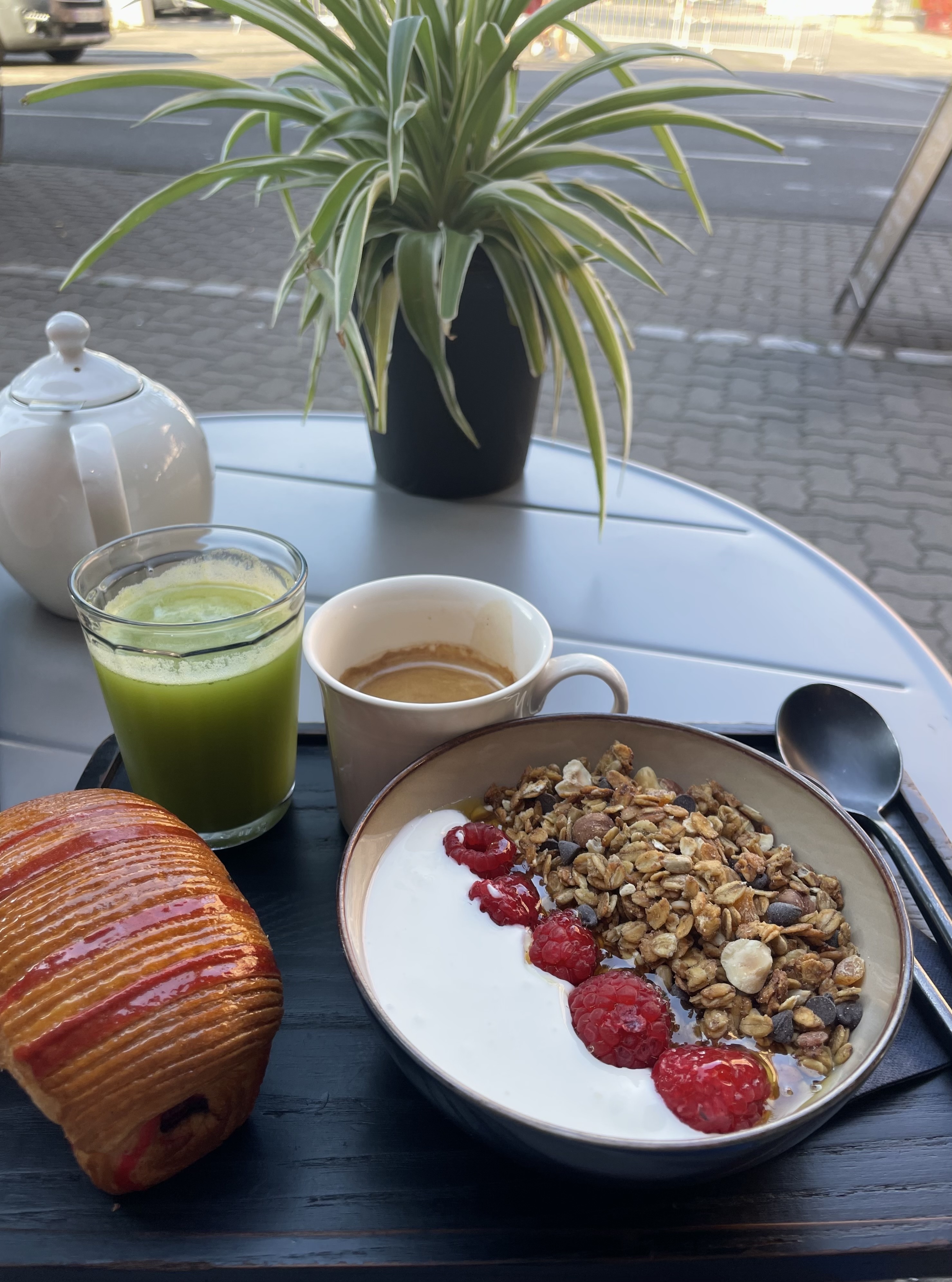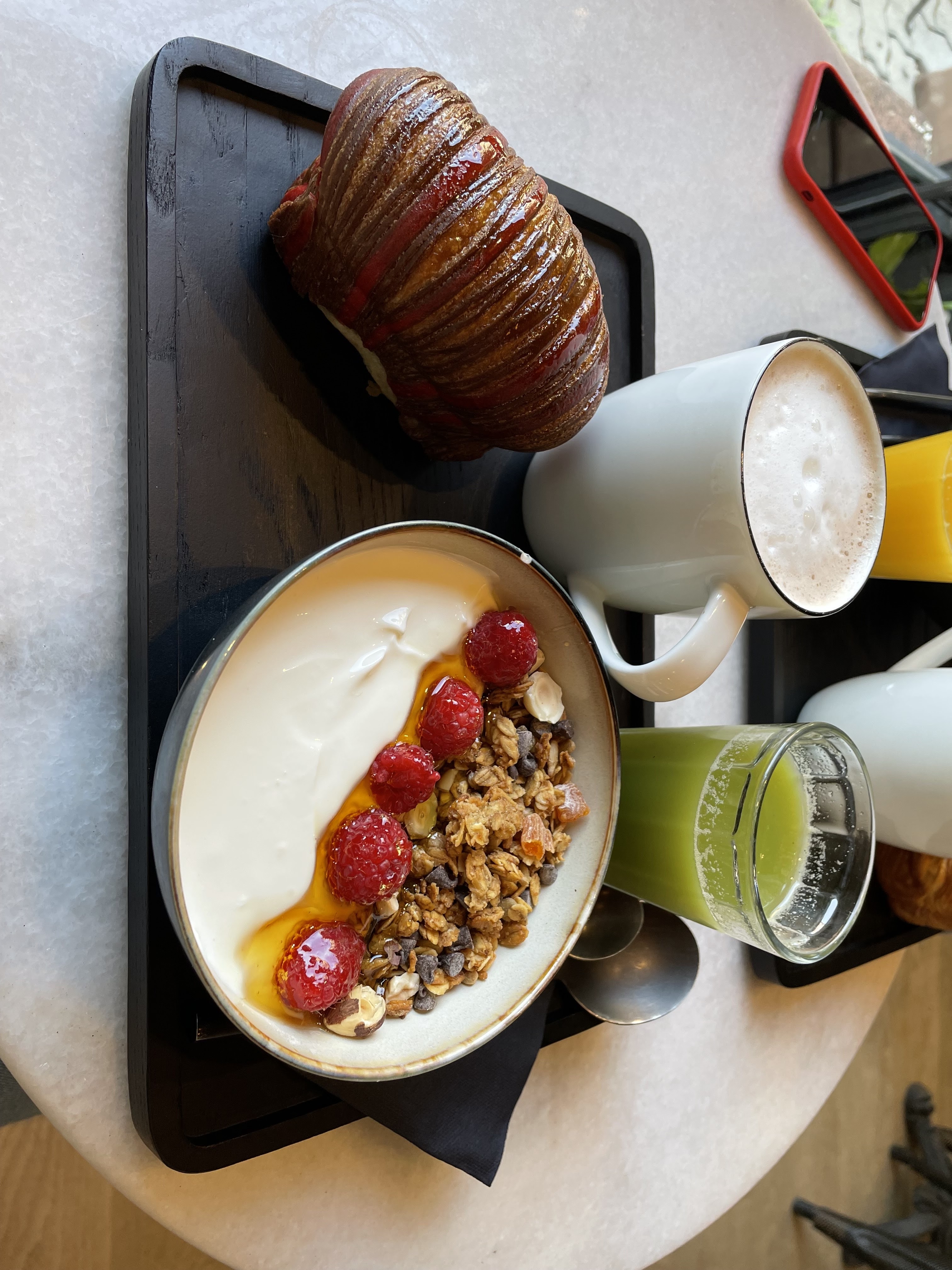 Formule petit déjeuner à 16€ avec une boisson chaude, une viennoiserie maison, un jus de fruits frais et un bol de fromage blanc granola. Le prix est sans doute un peu cher mais la qualité est au rendez-vous. Et c’est très copieux ! Je recommande si vous avez envie de prendre le temps de prendre un petit déjeuner.
