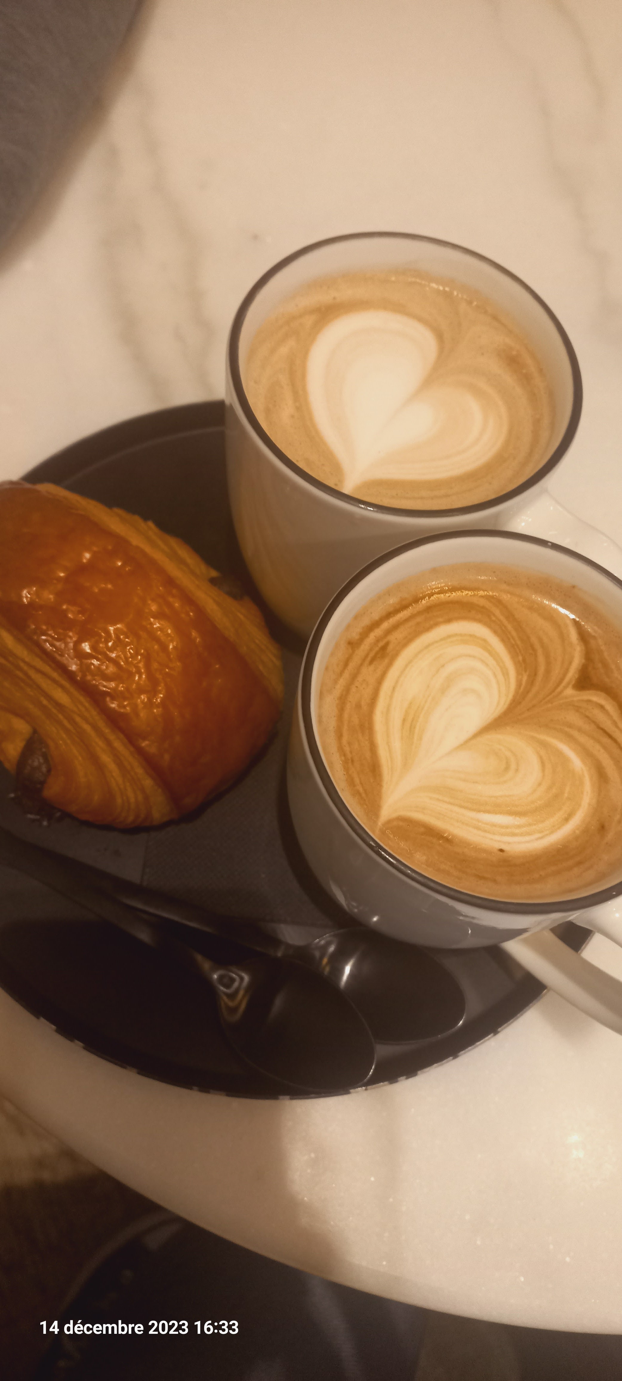 1ere fois pour moi accueil agréable, rien à dire. Par contre, le chocolat chaud n'était pas à la hauteur d'un vrai chocolat chaud car beaucoup trop dilué et le feuilleté vanille était vraiment light en crème Dommage pour le prix , on s'attend à mieux Le petit pain à la noisette était top ainsi que le croissant aux amandes