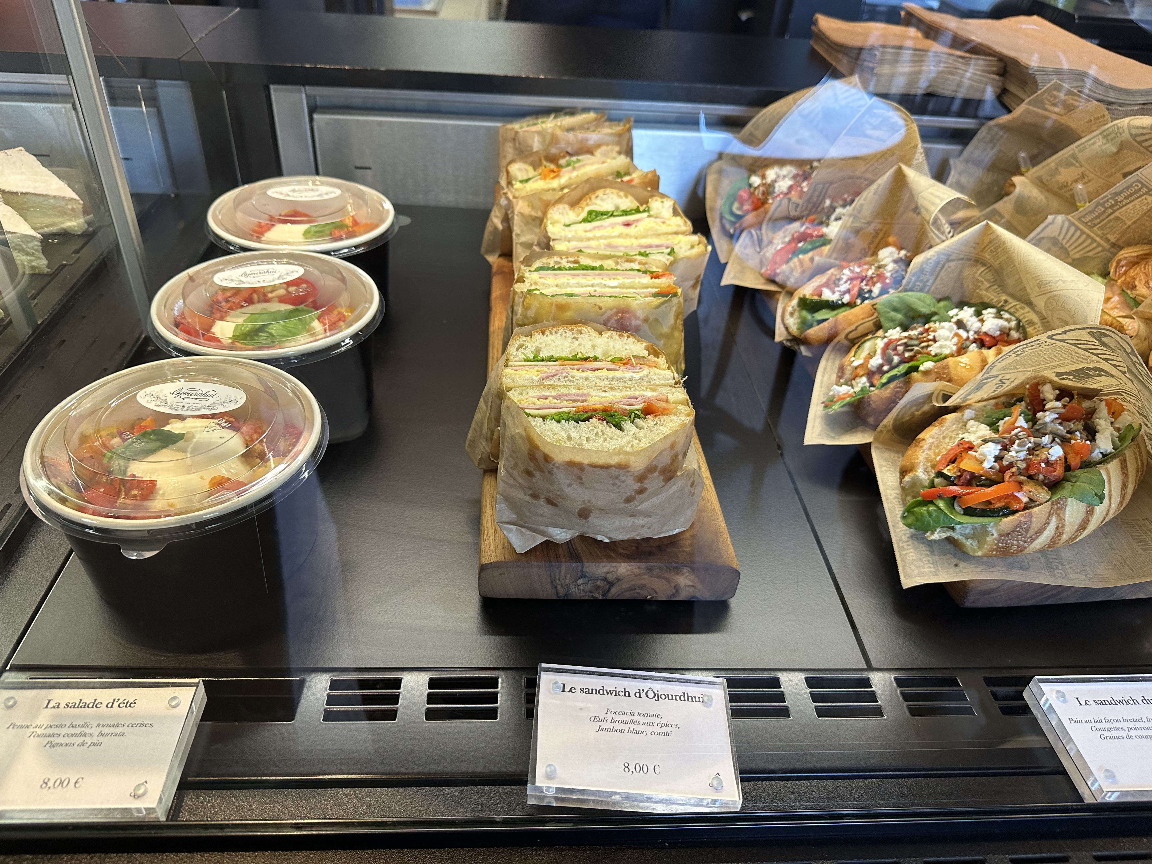 Nous avons acheté 2 sandwiches jambon, fromage, salade de mâche et cornichons aigres doux en fines lamelles: un délice ! Pas courant dans la famille des sandwiches. Avec une excellente tartelette au citron....Très bonne adresse !