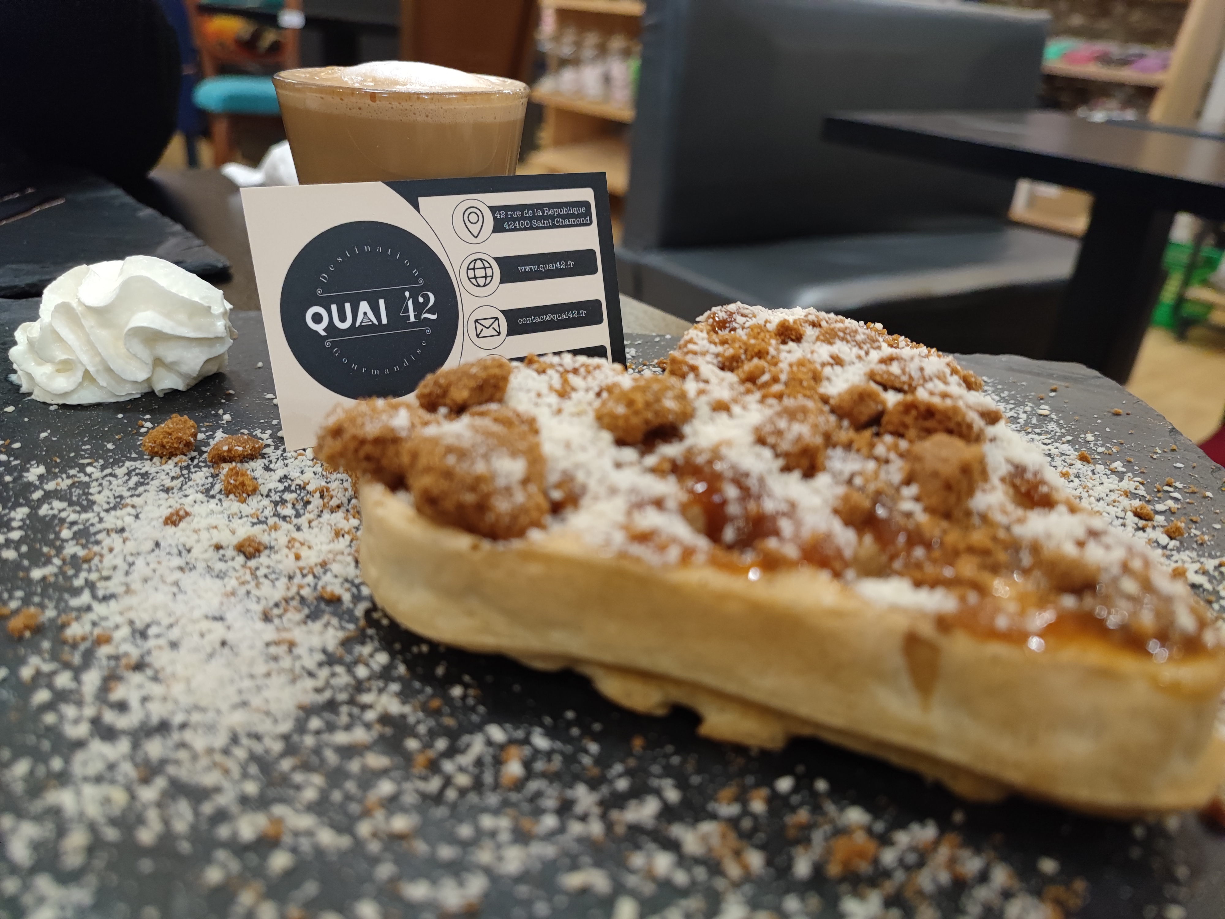 Je conseille fortement ! Endroit très propre, personnel au top, les produits sont de qualité et très bon. Ambiance très agréable. Parfait pour un petit goûter. Il fait également des petits événement (humoriste etc). Ce genre de commerce nous manque à St-Chamond. Merci encore au quai 42 pour leur accueil et leurs panecake délicieux.