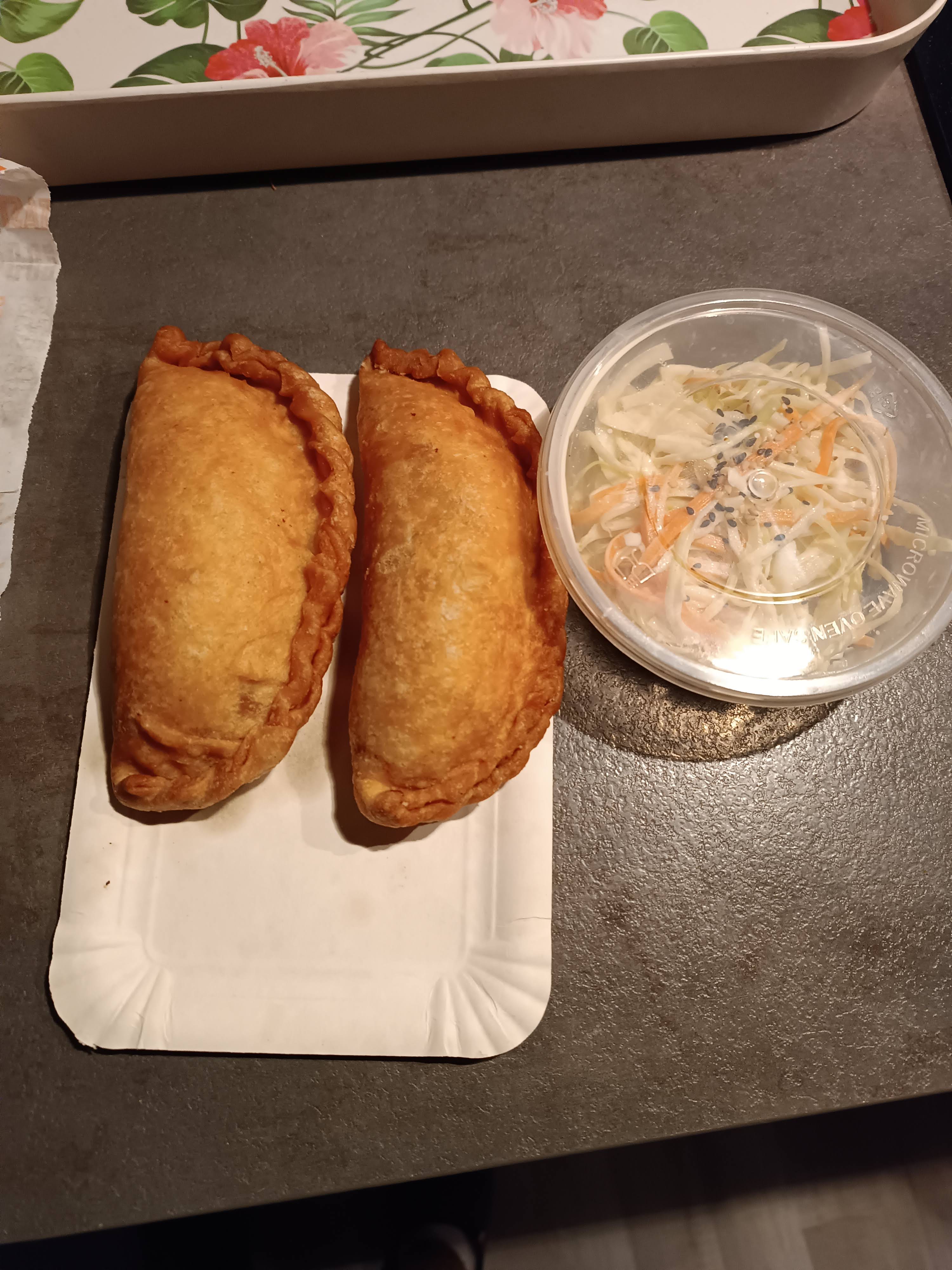 Dégustation des chaussons ou beignets au poulet pour la première fois ! Super bon ! La salade de choux également ! Bonne continuation madame !