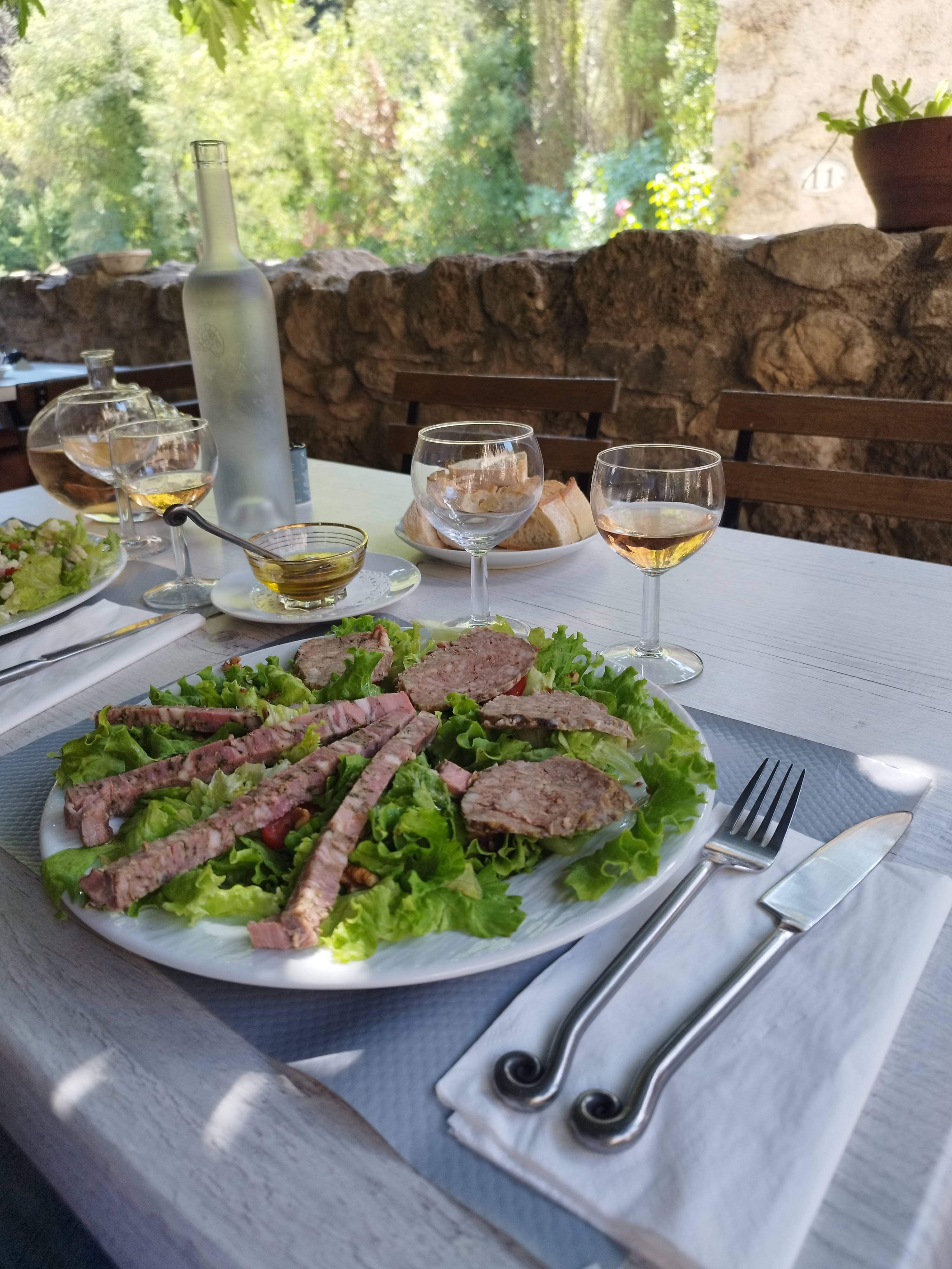 Après avoir parcouru les ruelles de ce petit village que j'aime tant, nos pas nous ont guidés vers ce hâvre de paix, bien à l'écart de la foule et du tumulte. Les salades étaient parfaites et le dessert exquis! Quant au petit vin rosé du patron... 😍 Ajoutons à cela un cadre enchanteur, bercé par le mumure du ruisseau... 🙏 Pourvu que ce lieu reste confidentiel!