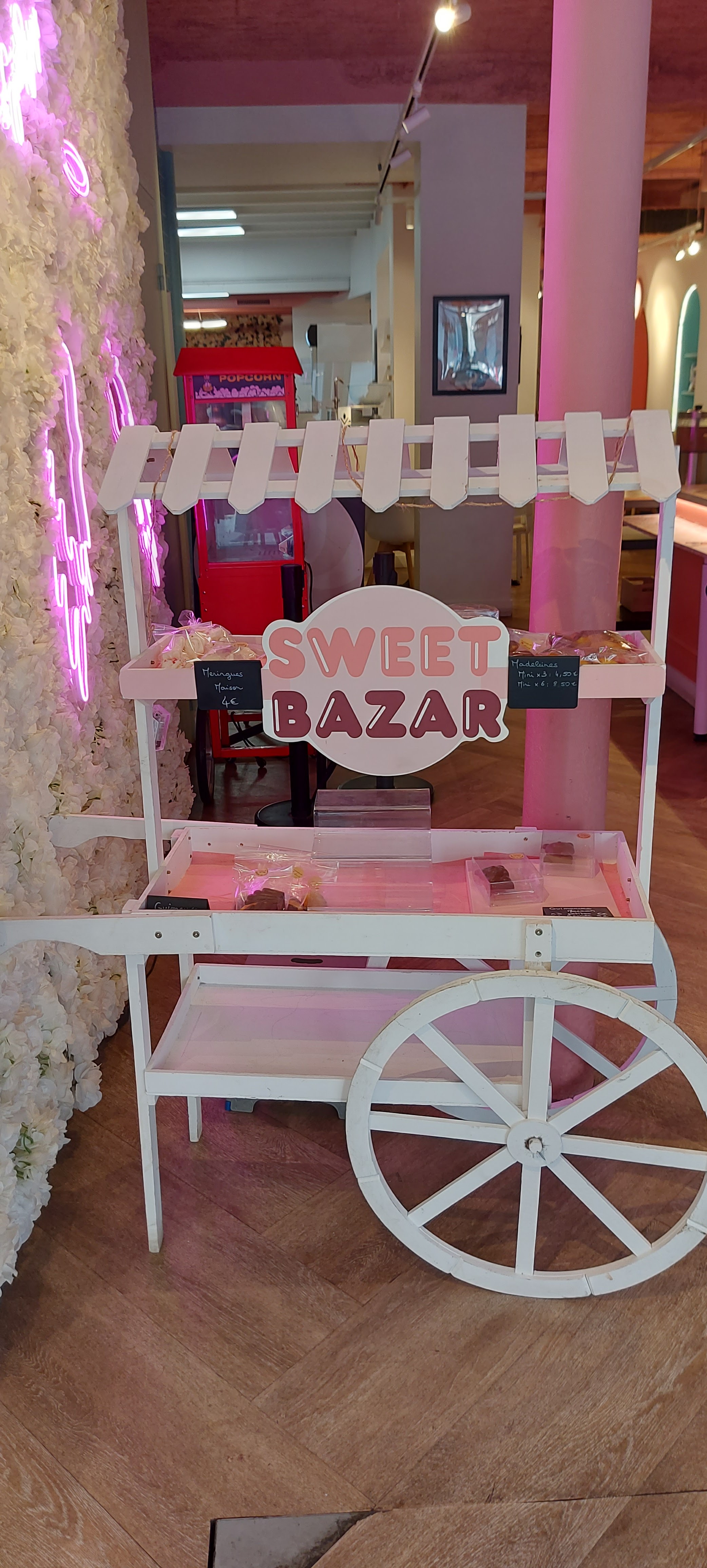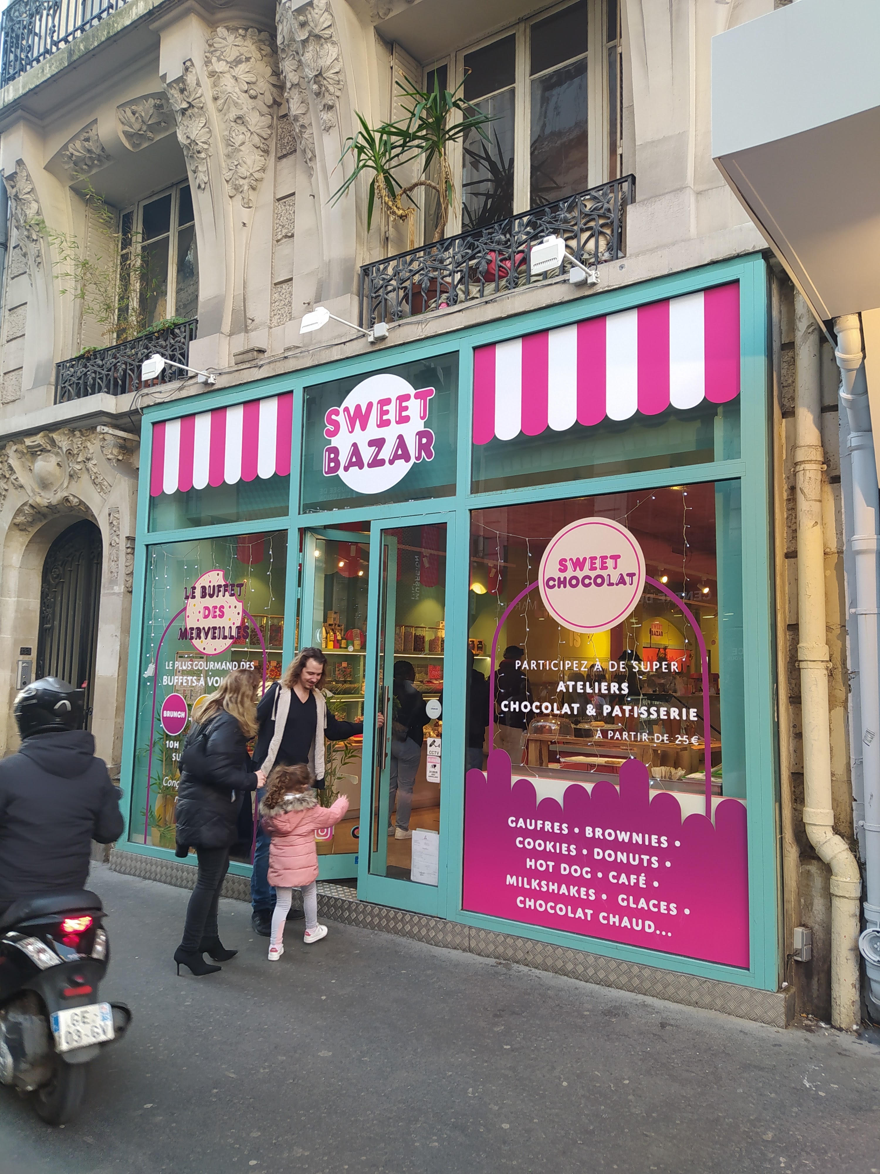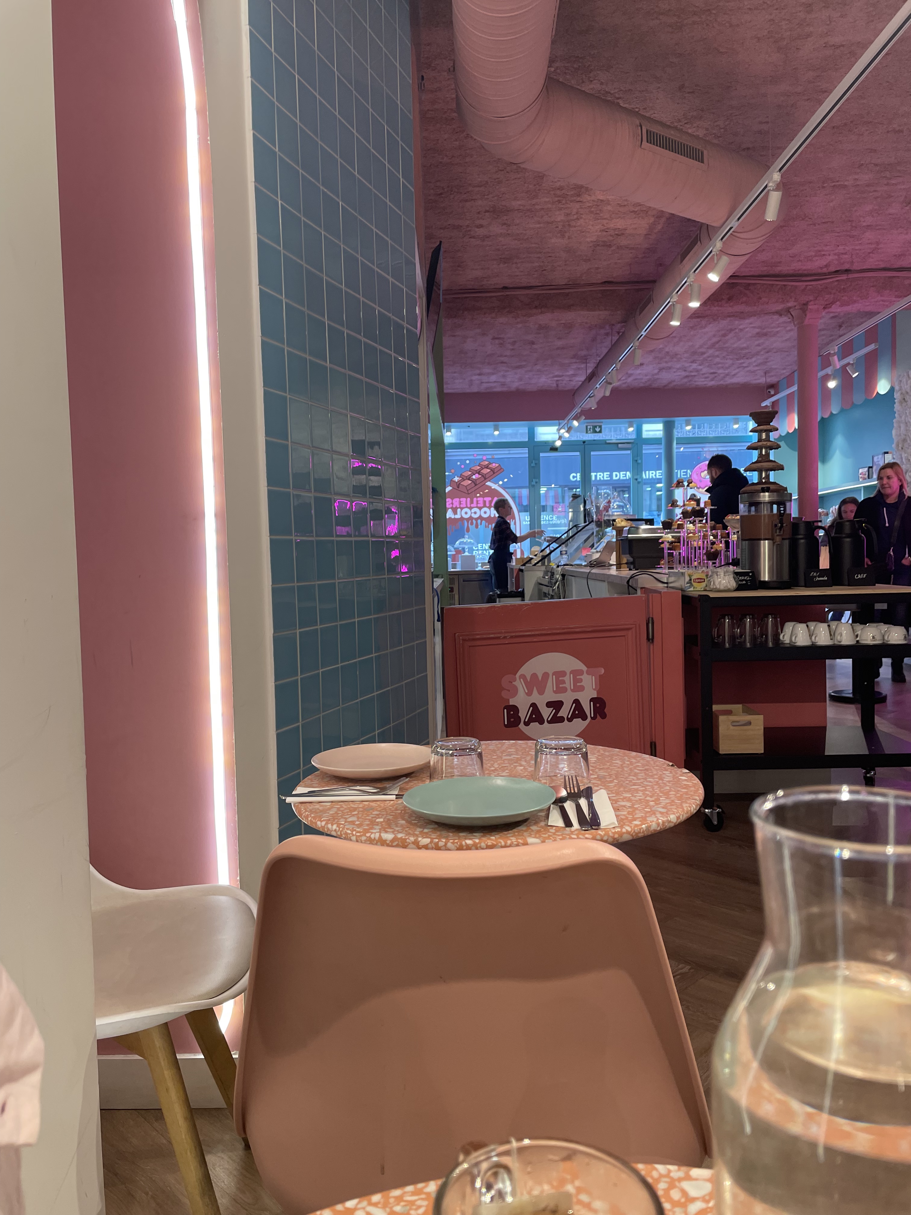 Nous venons de faire notre premier brunch au Sweet Bazar. Le lieu est vraiment agréable et la décoration ne peut laisser indifférents petits et grands. L’ensemble de l’équipe est également très agréable. Le choix de salé est plutôt restreint mais la qualité est correcte. Concernant le sucré nous avons été déçus, pas de jolis donuts comme ceux présentés sur Instagram mais uniquement ceux au sucre ou au chocolat, un seul choix de cupcakes, des viennoiseries un peu sèches… Le café dans un Thermos est aussi dommage quand, à côté la machine à café reste silencieuse. Beaucoup de petits points à améliorer pour parfaire l’expérience mais surtout pour justifier le rapport qualité prix. 27 euros pour ma fille de 3 ans qui a bu un chocolat chaud, mangé un cupcake et une Madeline, ça pique ! La note de 4 étoiles reste haute car il y a aussi de jolis points positifs : le chocolat chaud et la fontaine de chocolat sont d’excellente qualité, la vue sur le laboratoire est très sympa et l’equipe adorable.