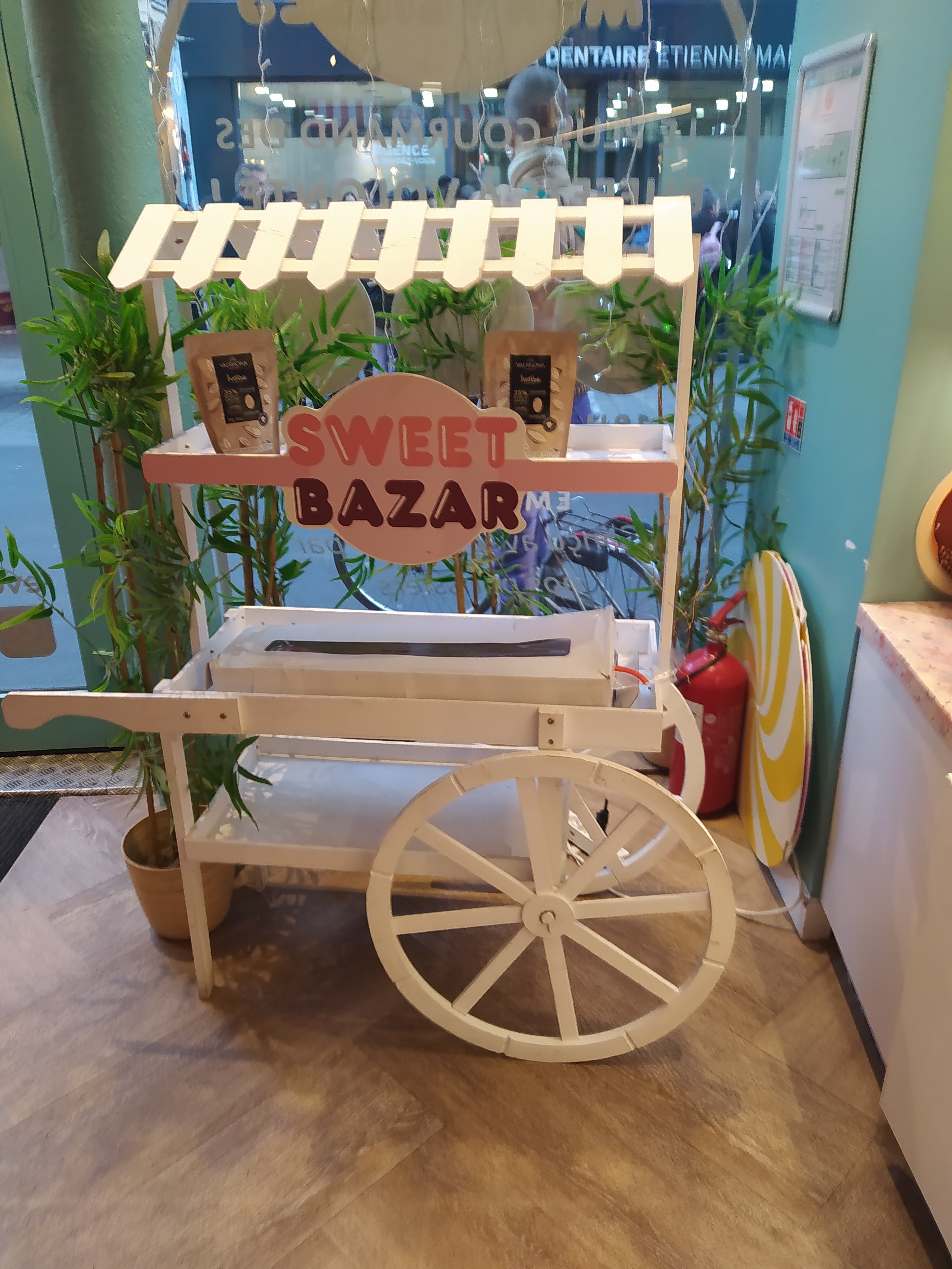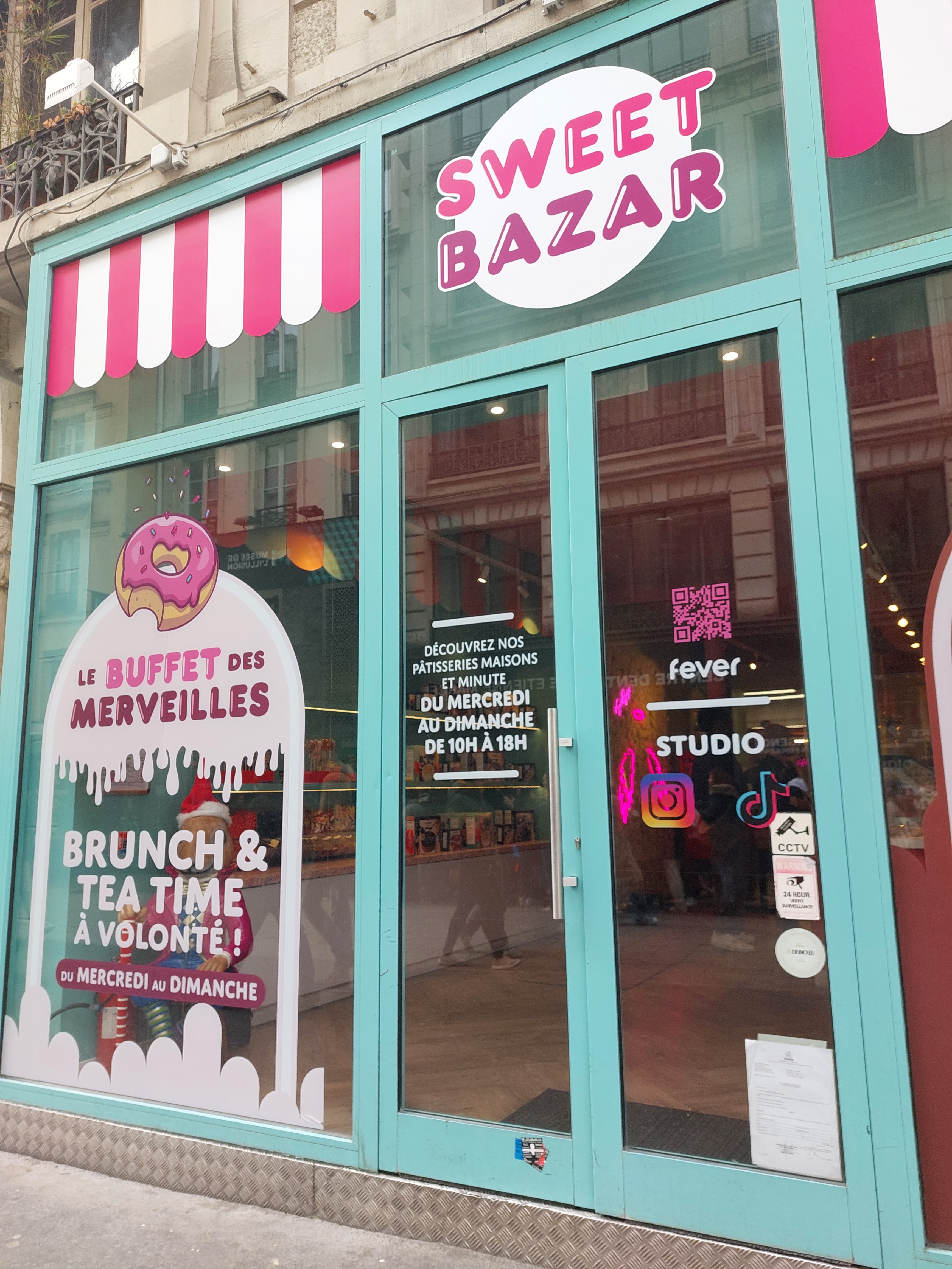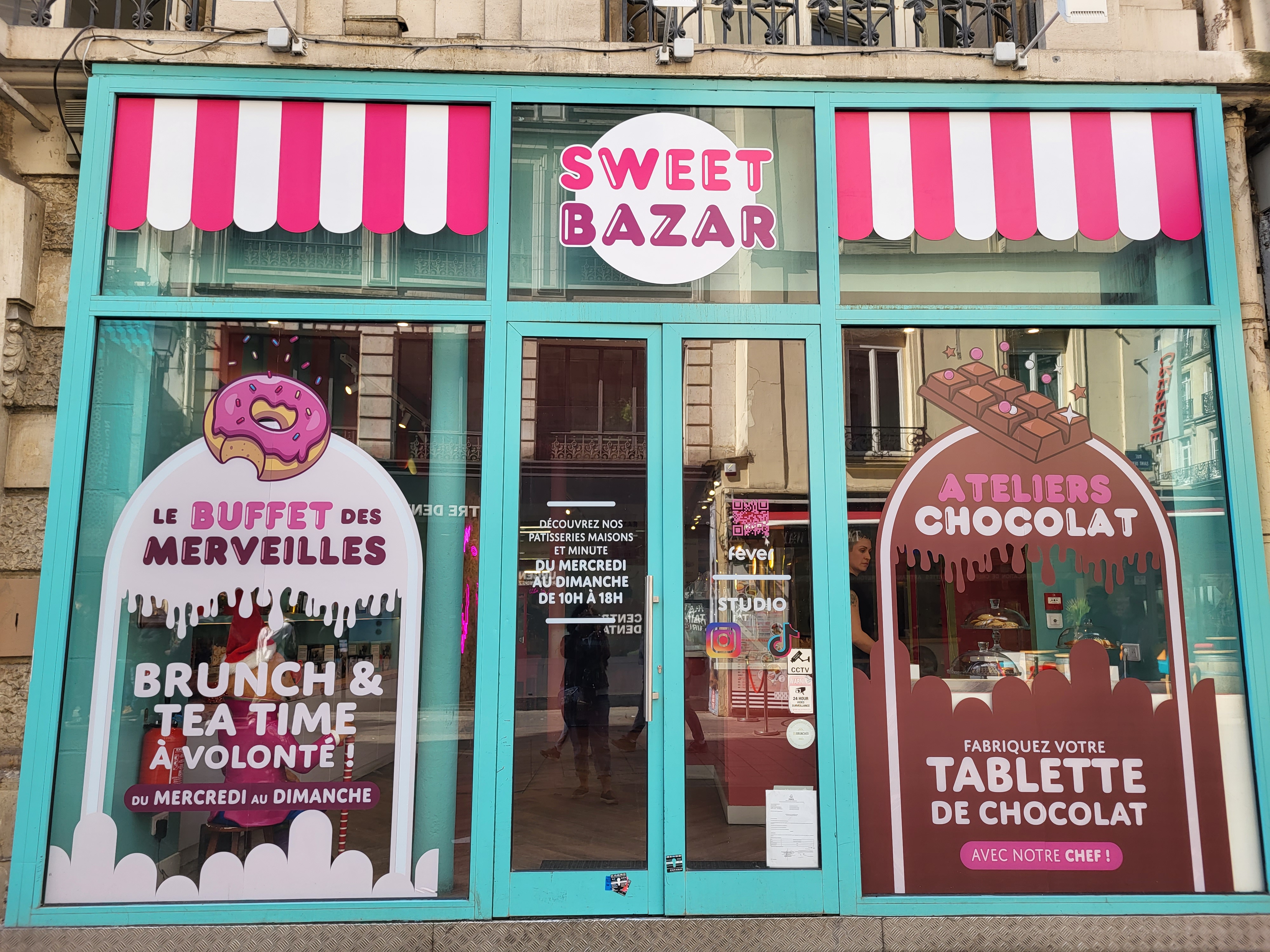 Nous venons de faire notre premier brunch au Sweet Bazar. Le lieu est vraiment agréable et la décoration ne peut laisser indifférents petits et grands. L’ensemble de l’équipe est également très agréable. Le choix de salé est plutôt restreint mais la qualité est correcte. Concernant le sucré nous avons été déçus, pas de jolis donuts comme ceux présentés sur Instagram mais uniquement ceux au sucre ou au chocolat, un seul choix de cupcakes, des viennoiseries un peu sèches… Le café dans un Thermos est aussi dommage quand, à côté la machine à café reste silencieuse. Beaucoup de petits points à améliorer pour parfaire l’expérience mais surtout pour justifier le rapport qualité prix. 27 euros pour ma fille de 3 ans qui a bu un chocolat chaud, mangé un cupcake et une Madeline, ça pique ! La note de 4 étoiles reste haute car il y a aussi de jolis points positifs : le chocolat chaud et la fontaine de chocolat sont d’excellente qualité, la vue sur le laboratoire est très sympa et l’equipe adorable.
