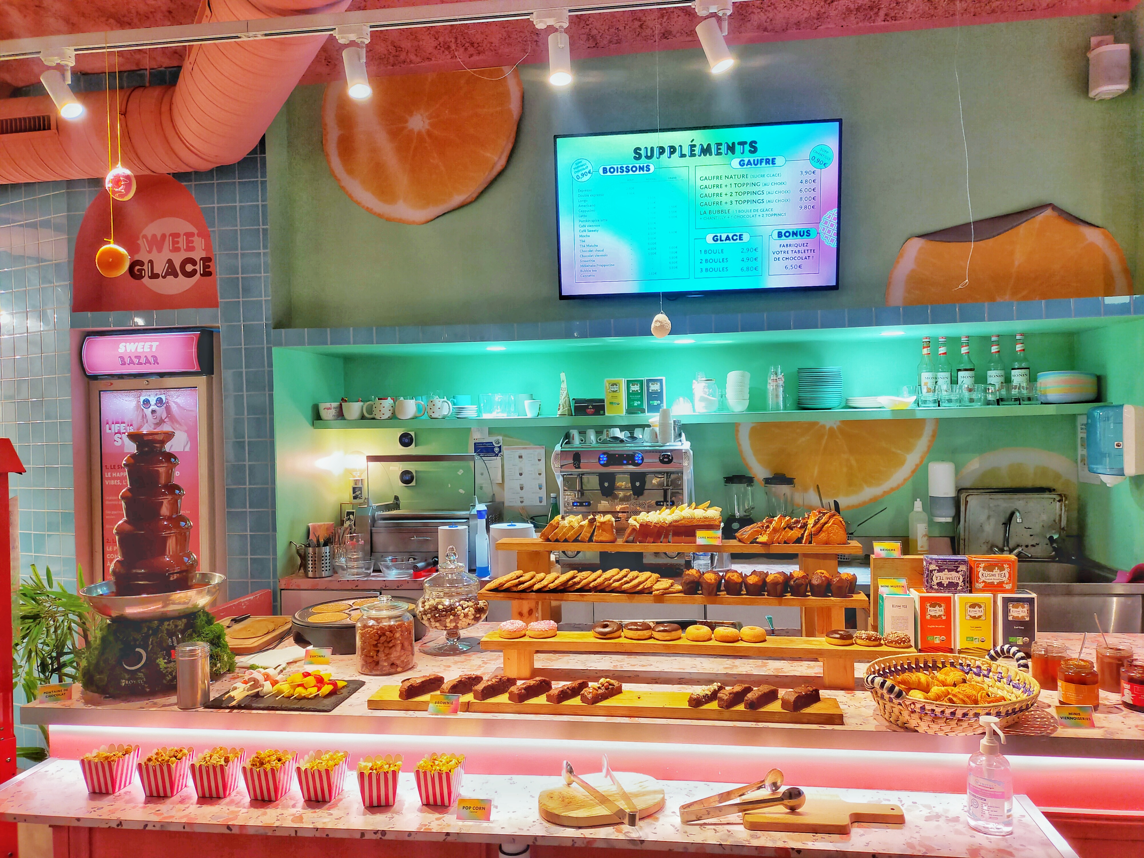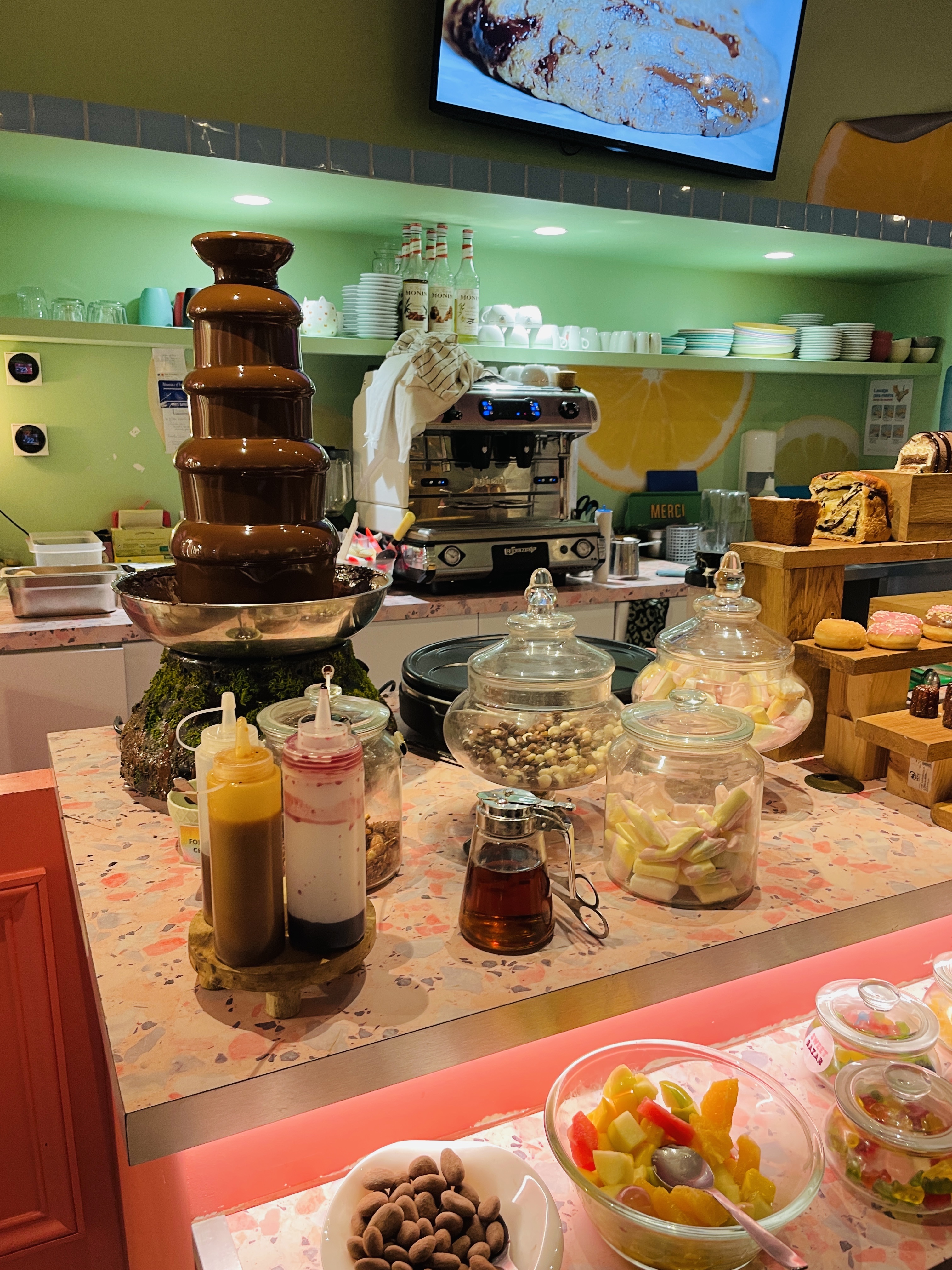 Le lieu est jolie et féerique. La décoration est colorée et attrayante. Nous avons pris la formule brunch. Le choix est correct en offre salé et sucré. La fontaine de chocolat noir est délicieuse. Néanmoins, le prix reste trop élevé par rapport à la qualité des produits et au choix qui reste limité. Les boissons chaudes ne sont pas à volonté … dommage !