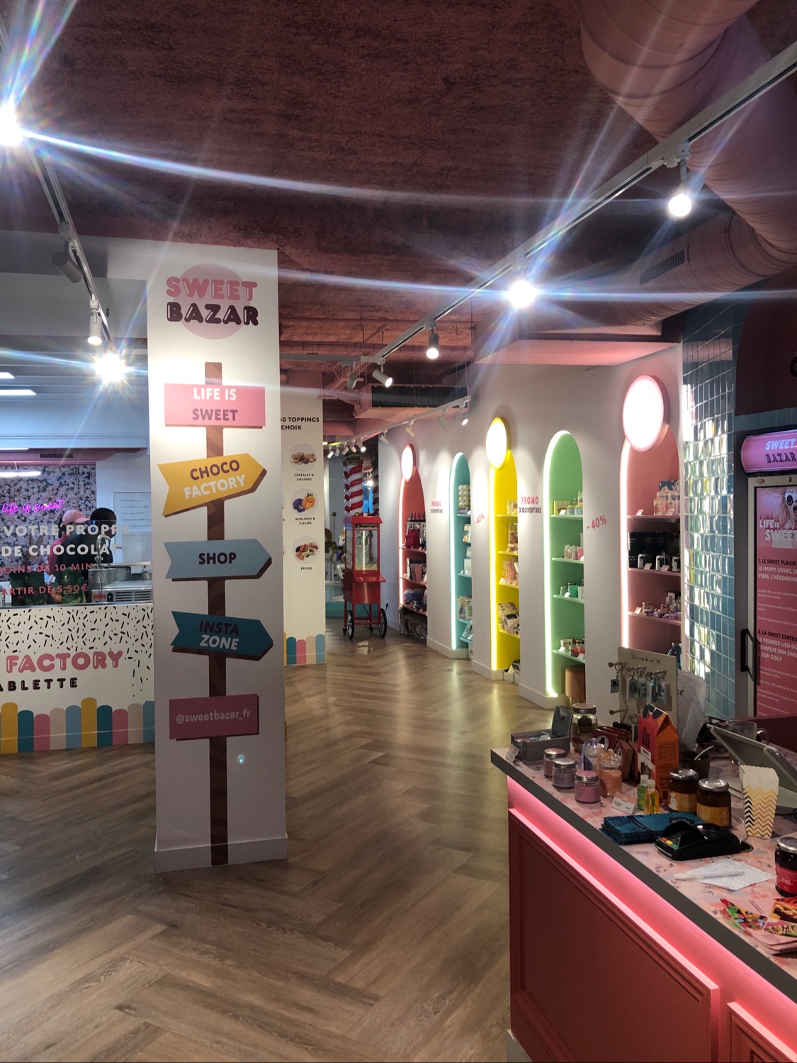 Lieu conceptuel sur le thème de la sucrerie. Une sorte de charlie et la chocolaterie on pourrais dire. Leur boutique est vraiment très joliment décoré et coloré m. On y trouve des pâtisserie et tout un autre tas de sucrerie comme des brownies, cookie, chocobomb, etc..... Il y a un service pour créer sa propre tablette de chocolat. Le personnel était souriant et chaleureux. Les produits sont un peu cher et qlqun sont exposés et servis tel quel c est un peu dommage surtout actuellement. A refaire avec l atelier fabrication.