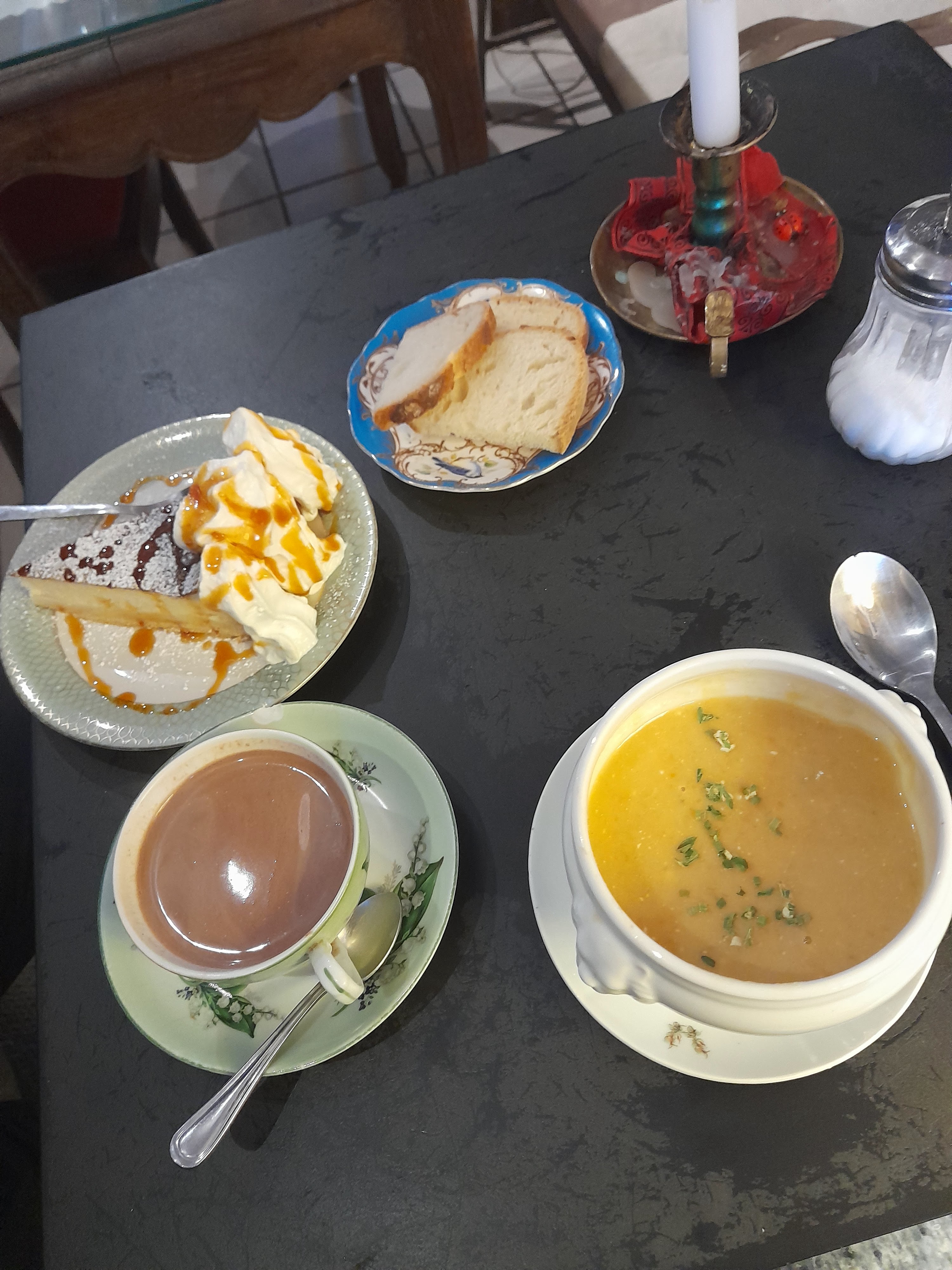 Petit café avec repas chaud tte la journée. Que du fait maison. Les pâtisseries un vrai délice. Et une décoration très atypique