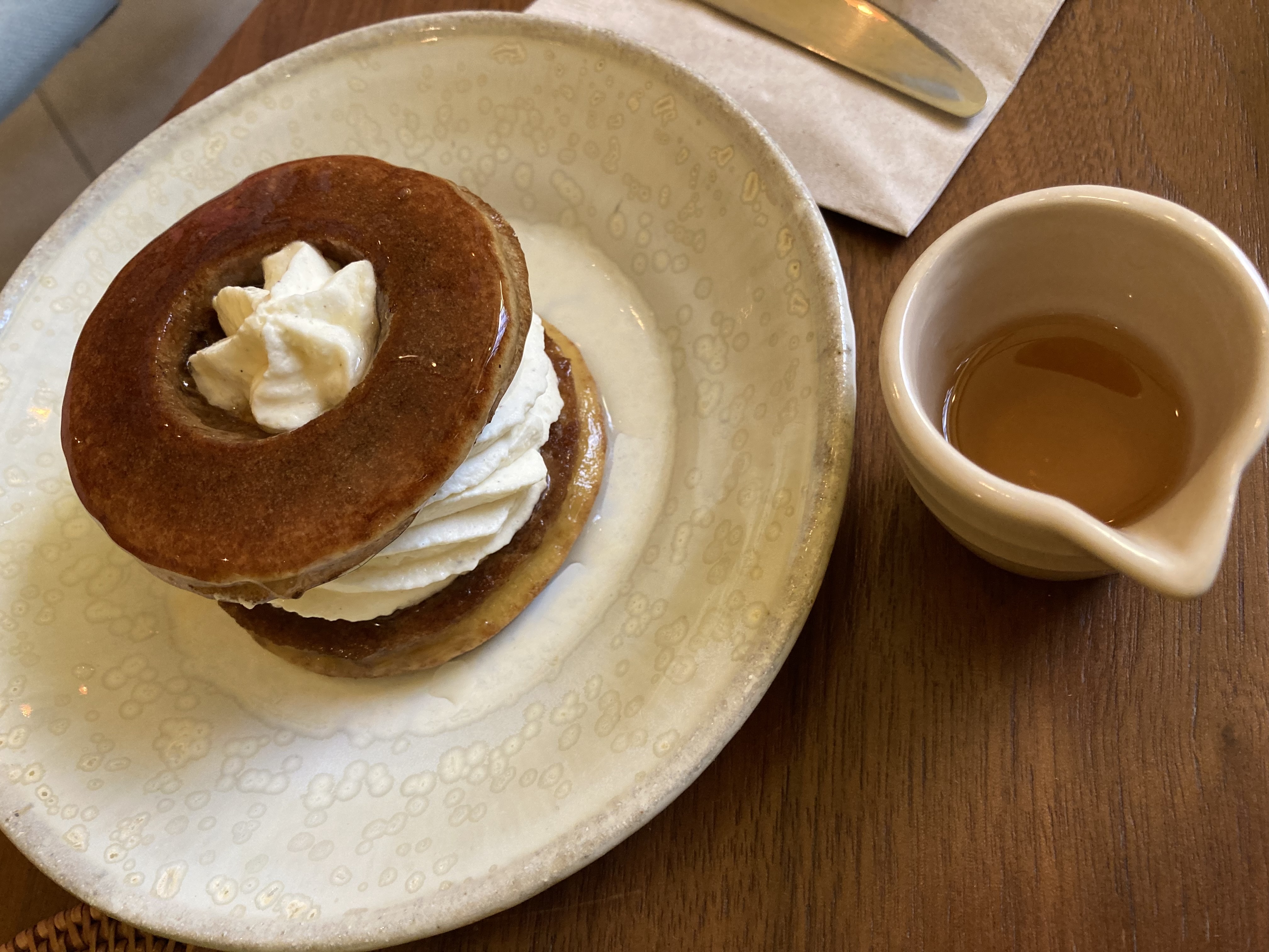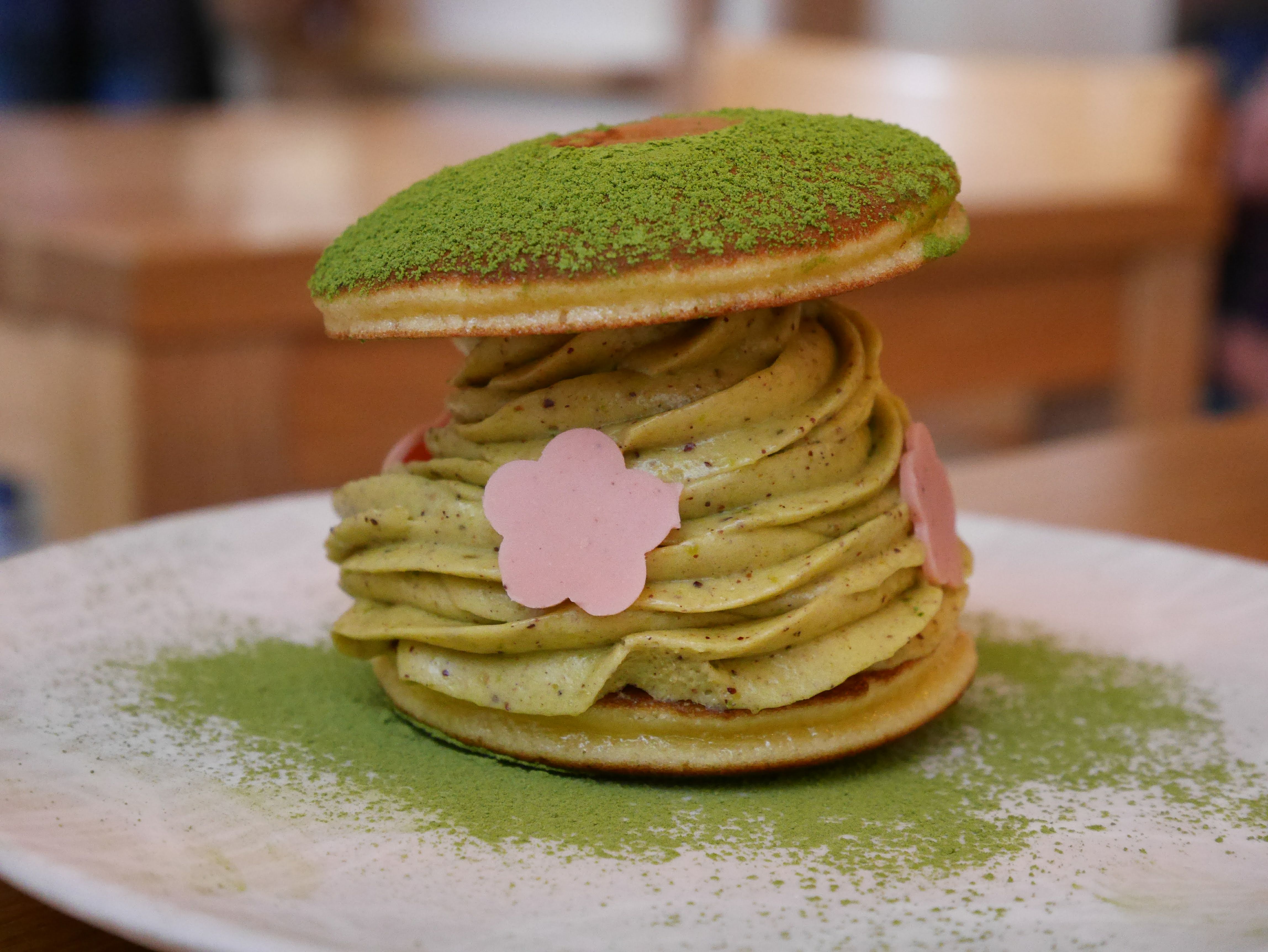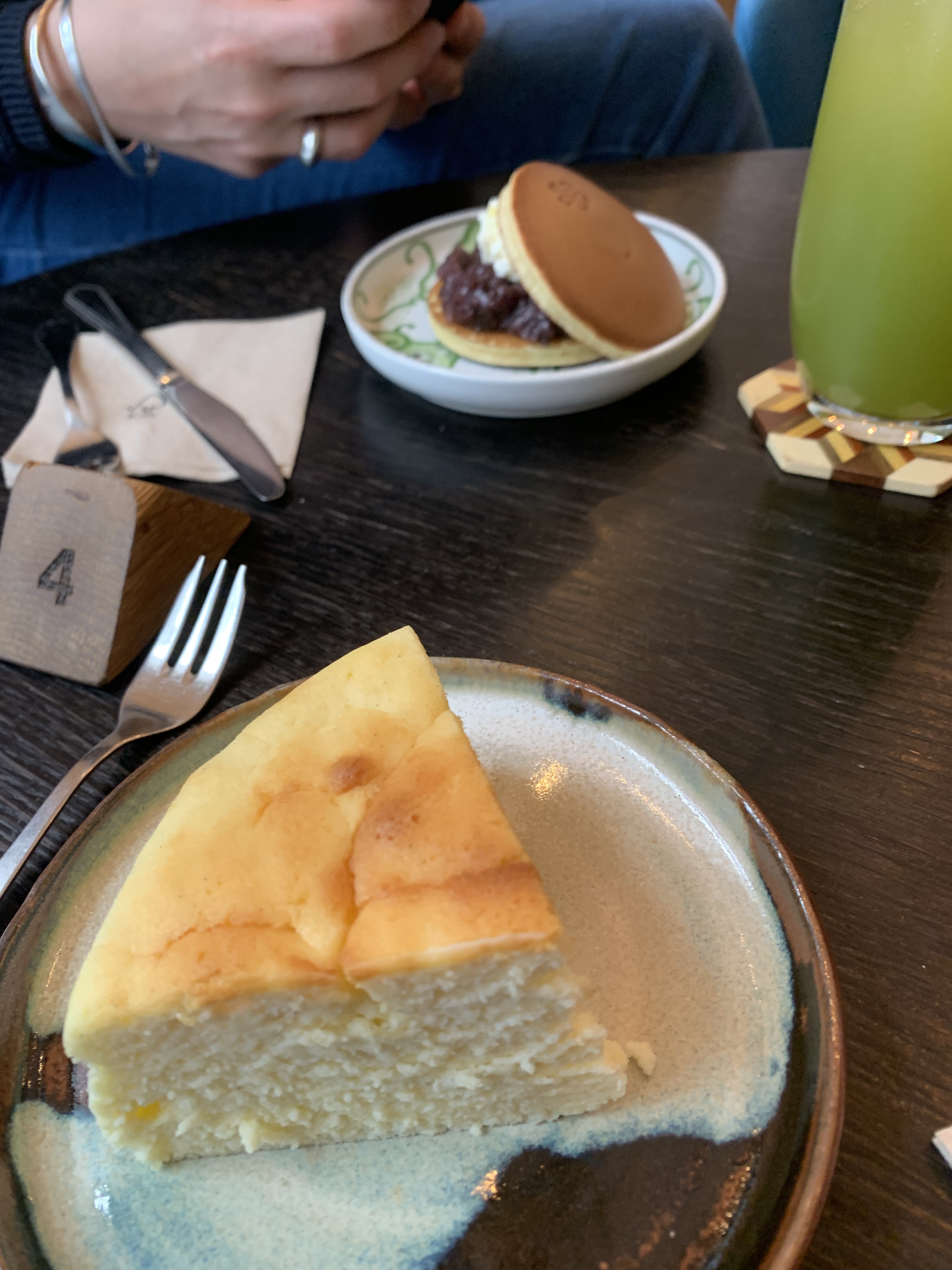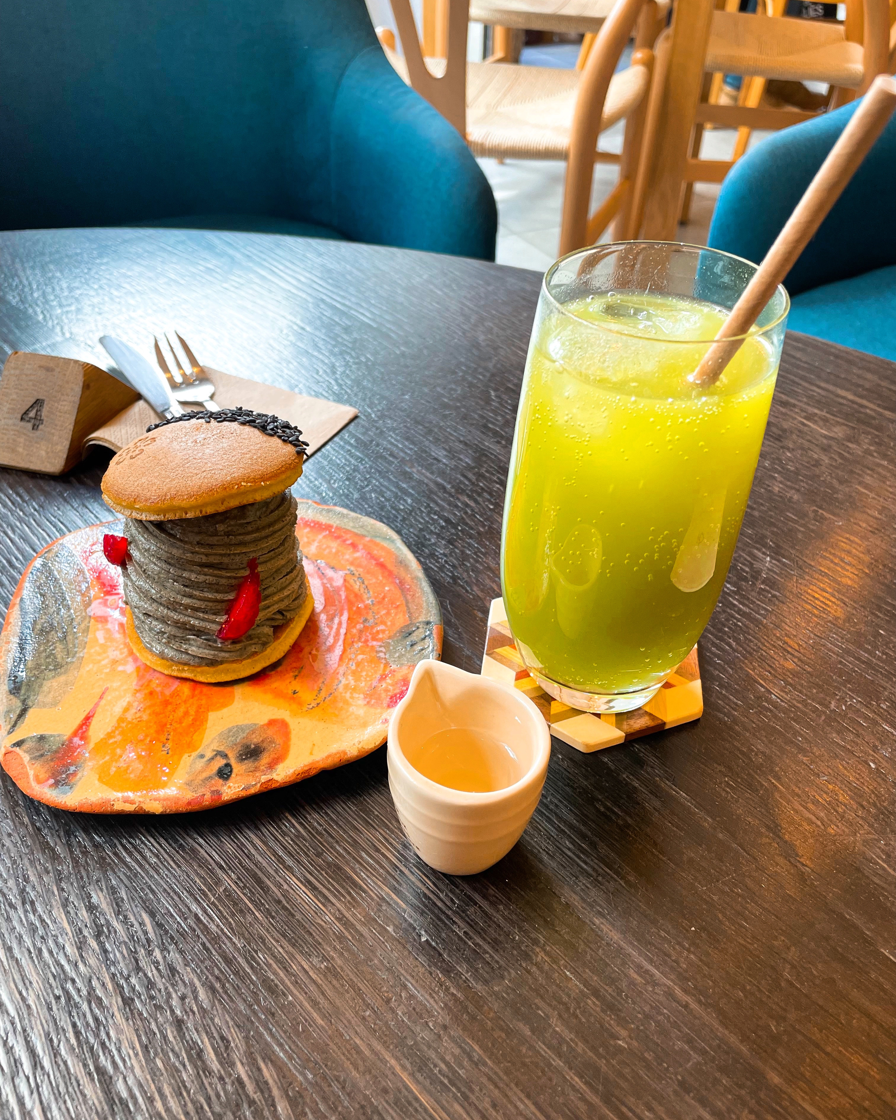 Machat latte est bon. Le dorayaki est peu sucré. Le prix est cher.
