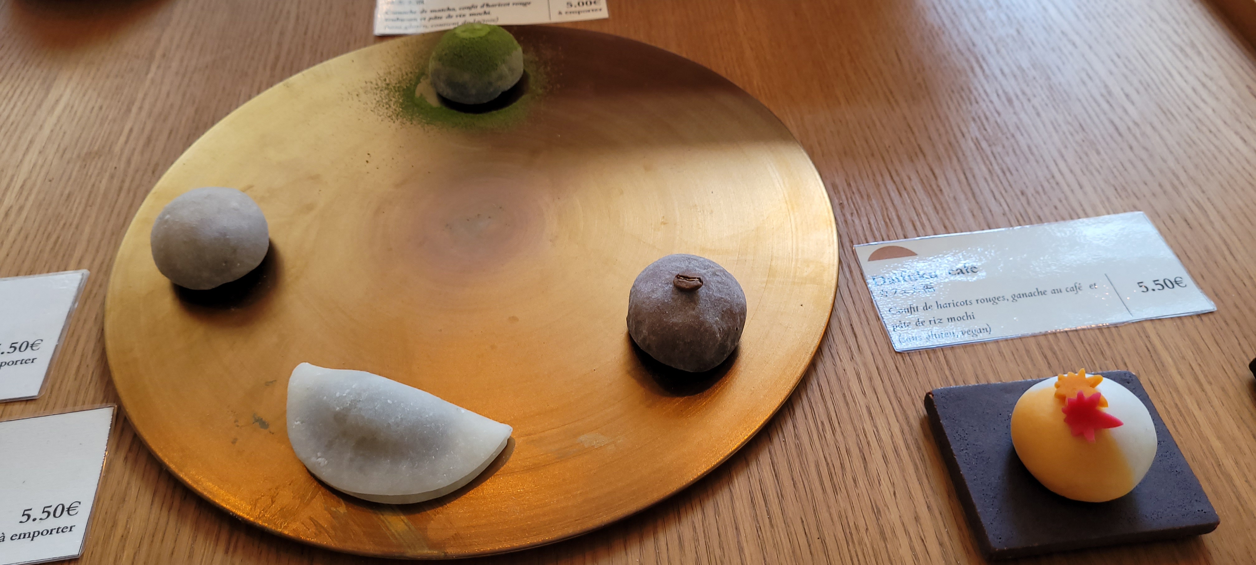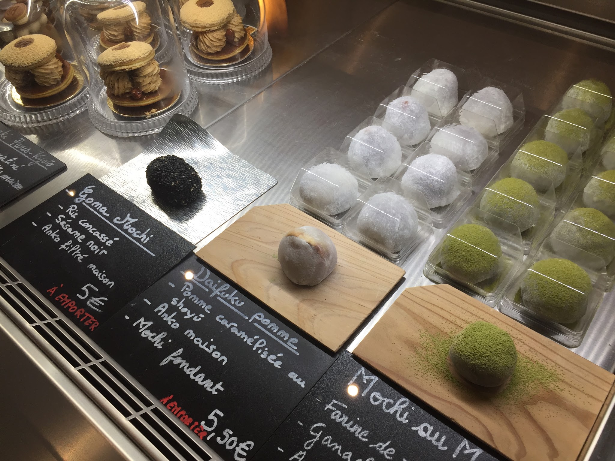De passage à Paris, nous avons prit à emporter les mochis sesame noir et haricot rouge/figue avec en boisson du matcha latte ! très bon peu sucré et la pâte du mochi est tendre ! Je recommande.