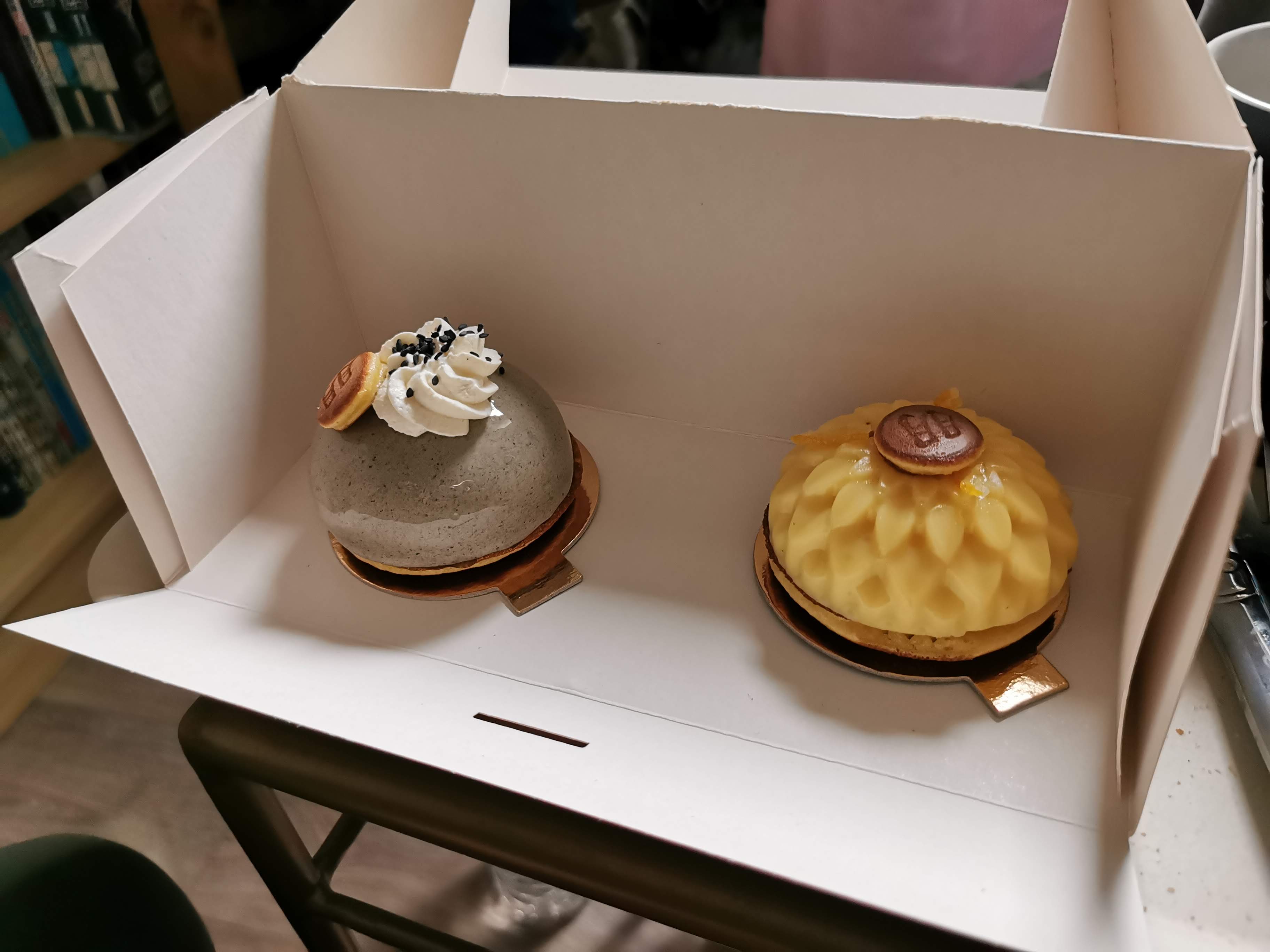 Belle présentation ! Un peu cher. Résumé : dorayaki poire-sésame intéressant et bon goût, mais poire absente. Dorayaki citronné décevant, proportion absurde de crème, monotone et redondant. Détail : Le dorayaki à gauche (dorayaki nashi, goût poire-sésame) était très bon avec sa mousse au sésame et son biscuit craquant au sésame très agréable en bouche, mais la poire est portée disparue, on ne la sent presque pas. Heureusement que le goût du sésame est maîtrisé ce qui en fait une expérience satisfaisante, mais il faut le voir avant tout comme un dorayaki au sésame. C'est trompeur de l'appeler nashi qui signifie poire. Pour le dorayaki à droite (dorayaki citronné, goût yuzu), c'est une énorme déception. Le goût est calqué sur celui de la crème d'une tarte au citron, les notes de yuzu sont noyées dans un volume beaucoup beaucoup trop important de crème, ce qui rend le tout redondant. Très acide et très sucré. En le coupant en deux, je m'attendais à trouver un peu de complexité à l'intérieur, comme celui au sésame, avec une couche de mousse, ou une meringue, un coeur de confiture de yuzu, une feuille croustillante pour la texture... Que nenni, c'est une demi sphère entière de crème citron. C'est mou, sucré, acide, redondant, sans nuance. Une tarte au citron meringuée ordinaire est plus intéressante. Le dorayaki citron est à éviter. Avis donc relativement mitigé. Il peut y avoir des bonnes surprises mais tout ne se vaut pas. Dommage car j'étais plus tenté par d'autres recettes dont le dorayaki façon tarte tatin qui n'était pas en vente ce jour-là, mais maintenant je suis incertain quant à la qualité de l'expérience qu'ils peuvent procurer.