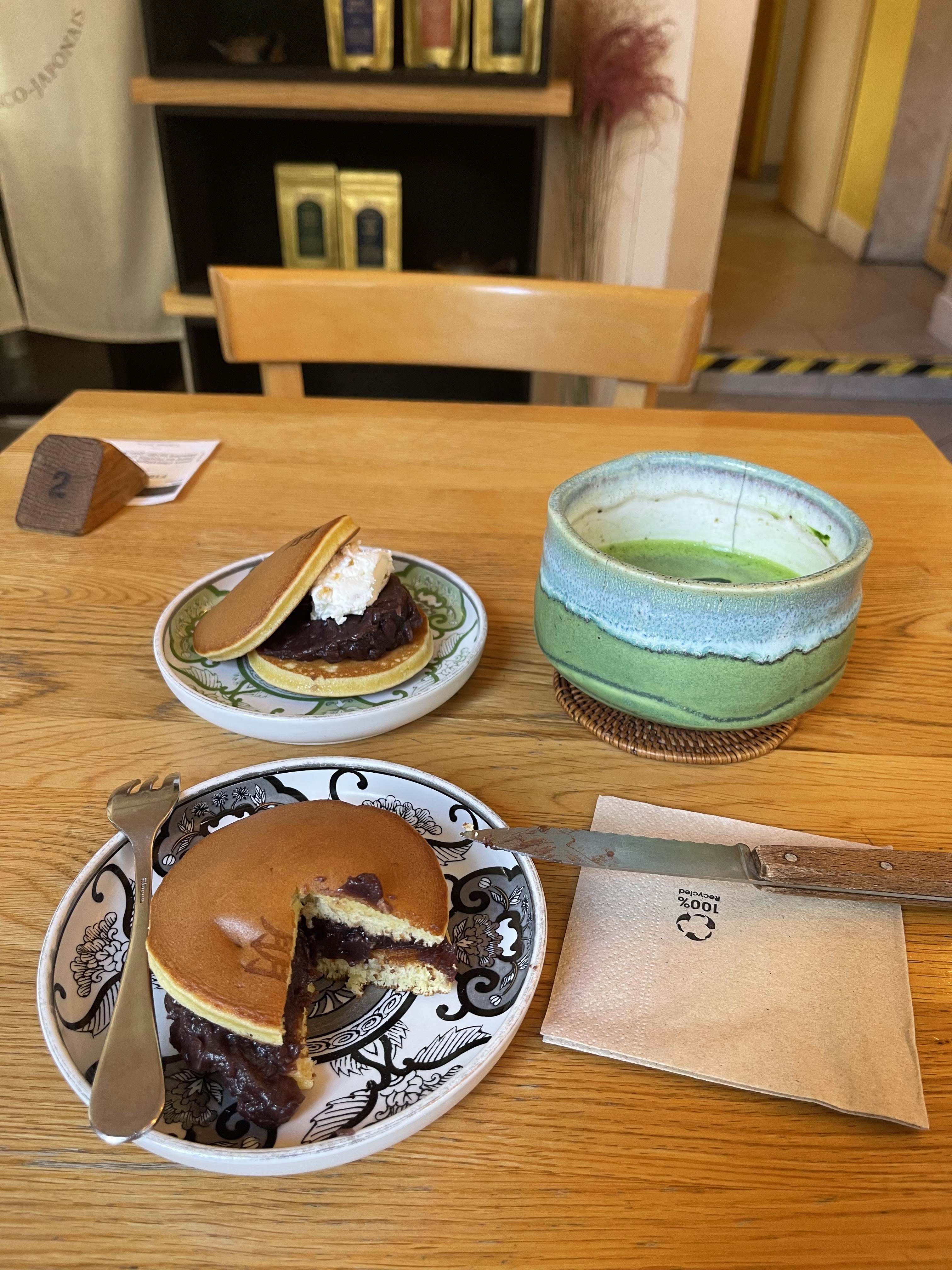 Profitant d’un instant de répit dans la semaine j’ai enfin pu goûter les fameux dorayaki traditionnel, accompagné d’un thé… une vrai réussite pour un moment de calme. Accueil chaleureux et produits de qualité… mais il faut souvent savoir patienter en ligne pour les déguster. La semaine c’est plus calme… à refaire…