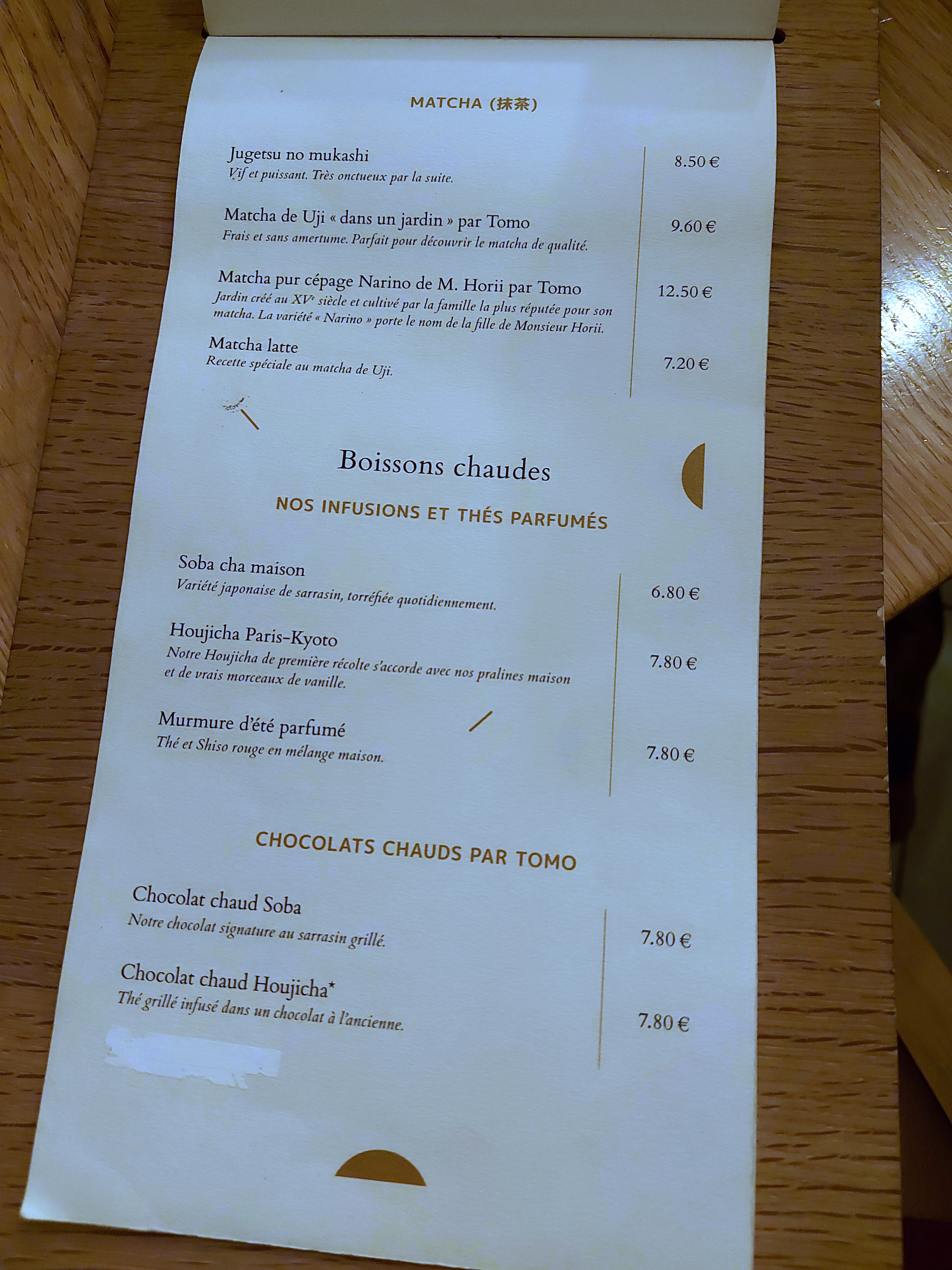 Très cher pour ce que c'est. Le rapport qualité/prix n'y est pas. La carte des thés japonais est assez large, mais là encore, je trouve les prix excessifs. Les pâtisseries ne sont pas mauvaises, mais sont loin d'être exceptionnelles. Ne parlons pas du yatsuhachi à plus de 5€ où l'on est à la limite du vol. Je ne connais pas le prix des matières premières, mais ça fait très cher la bouchée. À ce prix là, je conseille de se tourner vers les pâtisseries de Sadaharu Aoki. Ceci-dit, les mochis, bien que chers à l'unité sont par contre vraiment très bons. C'est la seule pâtisserie qui pour moi est suffisamment bien réalisée pour en justifier le prix. Avis mitigé donc, après mes quelques passages chez Tomo, qui je pense a su se construire une bonne réputation et fidéliser sa clientèle malgré un rapport qualité/prix peu intéressant.